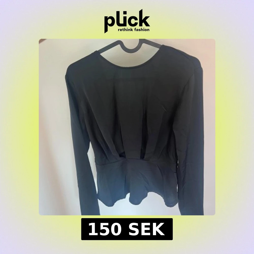 Säljer en svart omlottblus med lång ärm och markerad midja. Blusen har djup v-ringning i ryggen och ett lätt glansigt tyg som ger en elegant känsla. Perfekt att styla med jeans eller kjol. Använt fåtal gånger i storlek S🤍
