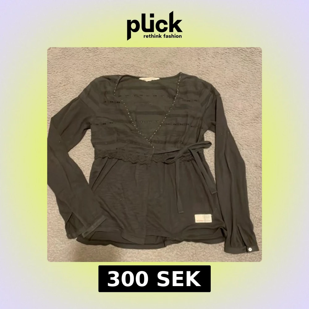 Supersnygg svart omlottblus från Odd Molly med långa ärmar, spetsdetaljer och knyt i midjan. Blusen har v-ringning med små nitar längs kanten och broderade mönster på överdelen. Perfekt att styla med jeans eller kjol.