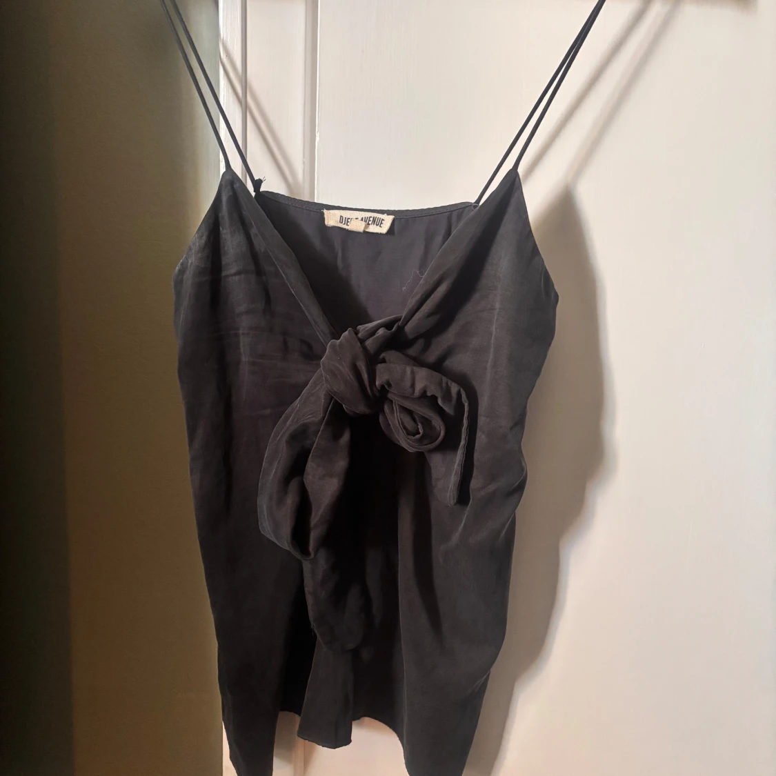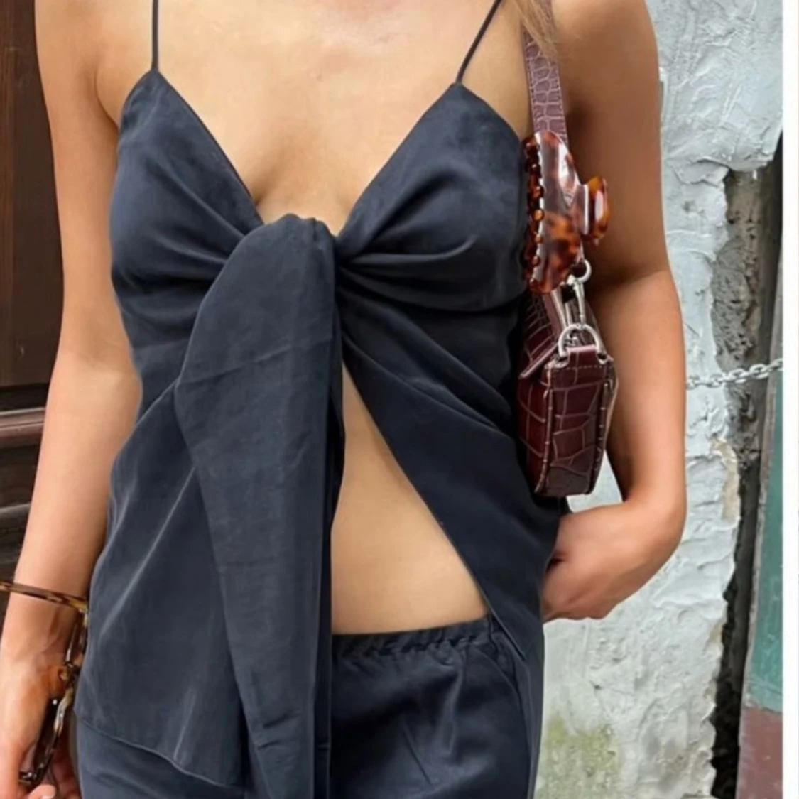 Supersnygg svart omlottopp från Djerf Avenue med tunna axelband och stor knytning framtill. Toppen har en croppad passform och är tillverkad i ett mjukt, slätt material som ger en lyxig känsla. Perfekt för att skapa en trendig och stilren look.