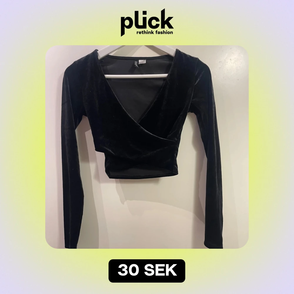 Snygg svart omlottopp i sammet från H&M Divided. Den har en elegant v-ringning och långa ärmar, perfekt för en kväll ute eller en fest. Toppen är i storlek XS.
