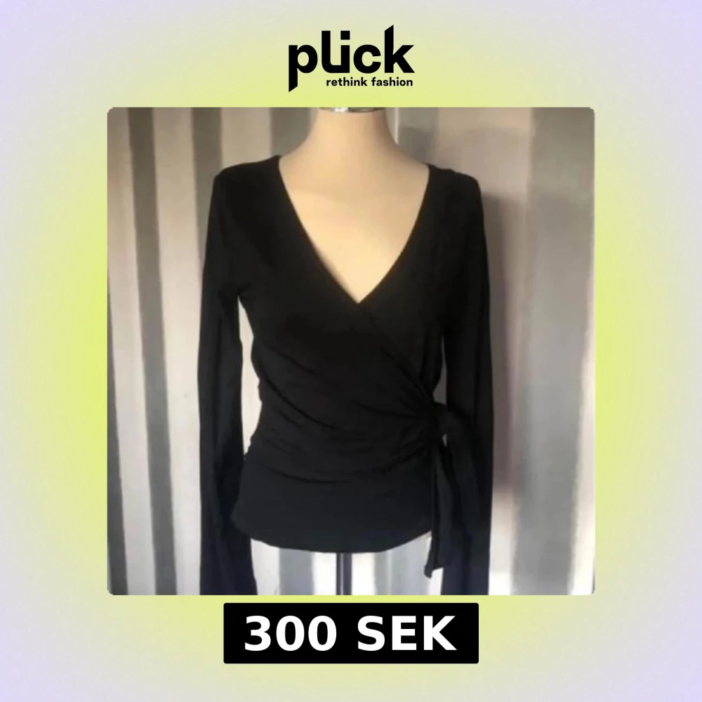 Snygg svart omlottopp med lång ärm och v-ringad hals. Toppen har ett knyt i midjan som ger en cool och figurnära passform. Materialet känns mjukt och stretchigt, perfekt för att skapa en stilren look. Passar dig som gillar minimalistisk och trendig stil.