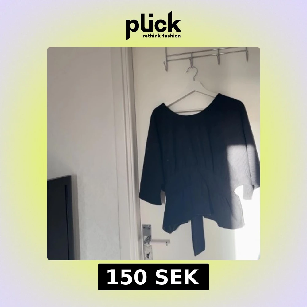 Säljer en svart omlottopp med breda trekvartsärmar och snygg knytning i ryggen. Toppen har en rundad halsringning och är tillverkad i ett mjukt tyg som ger en skön känsla. Perfekt för dig som gillar stilrena och trendiga plagg med lite extra detalj.