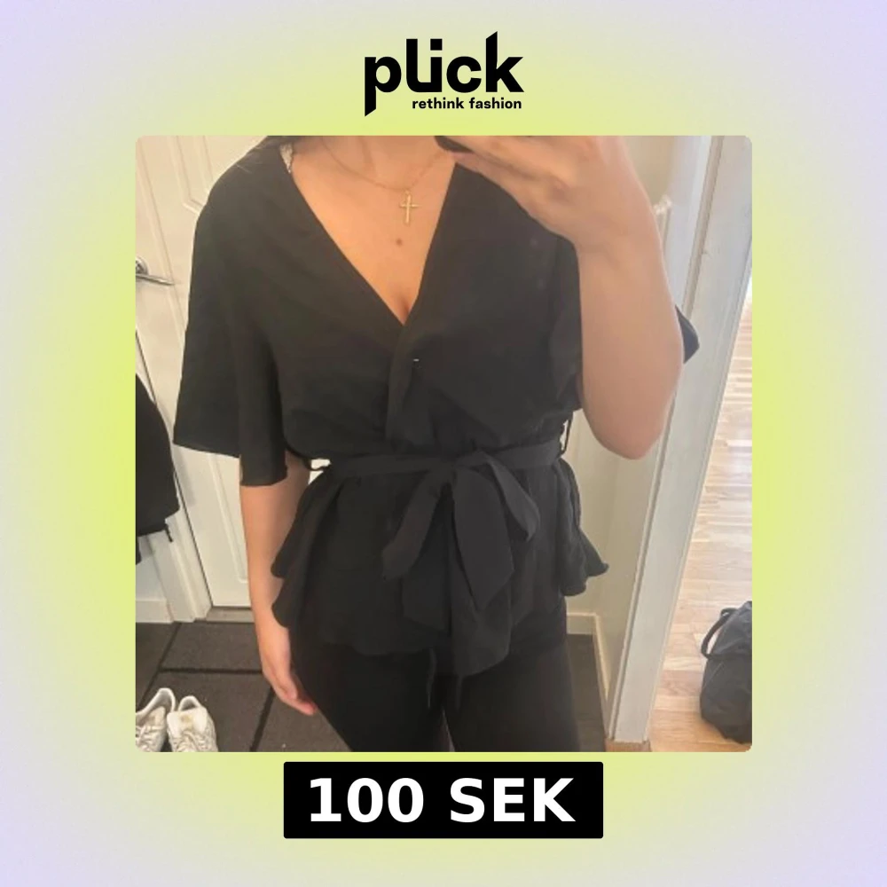 Snygg svart omlottopp med v-ringning och breda korta ärmar. Toppen har ett knytband i midjan som ger en markerad siluett och volangkant nedtill.