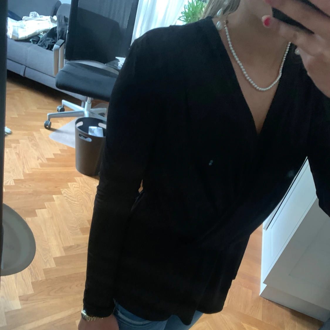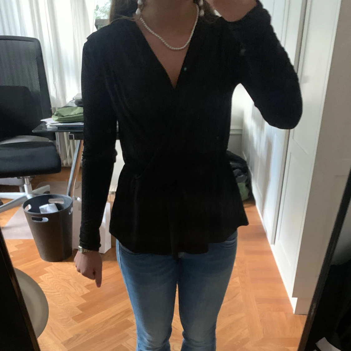 Snygg svart omlottopp med lång ärm och v-ringad hals. Materialet är jätte skönt. Den är knappt använd!