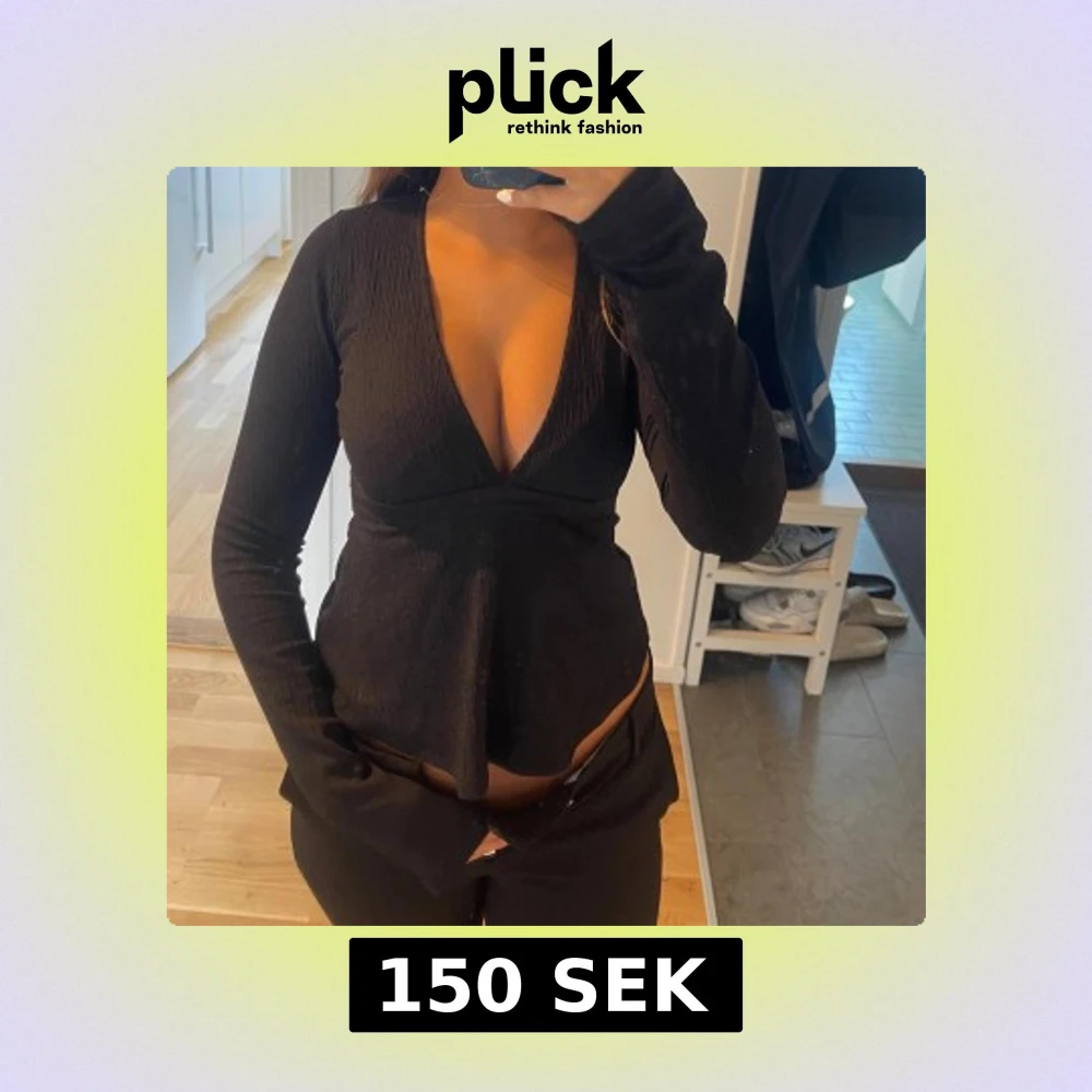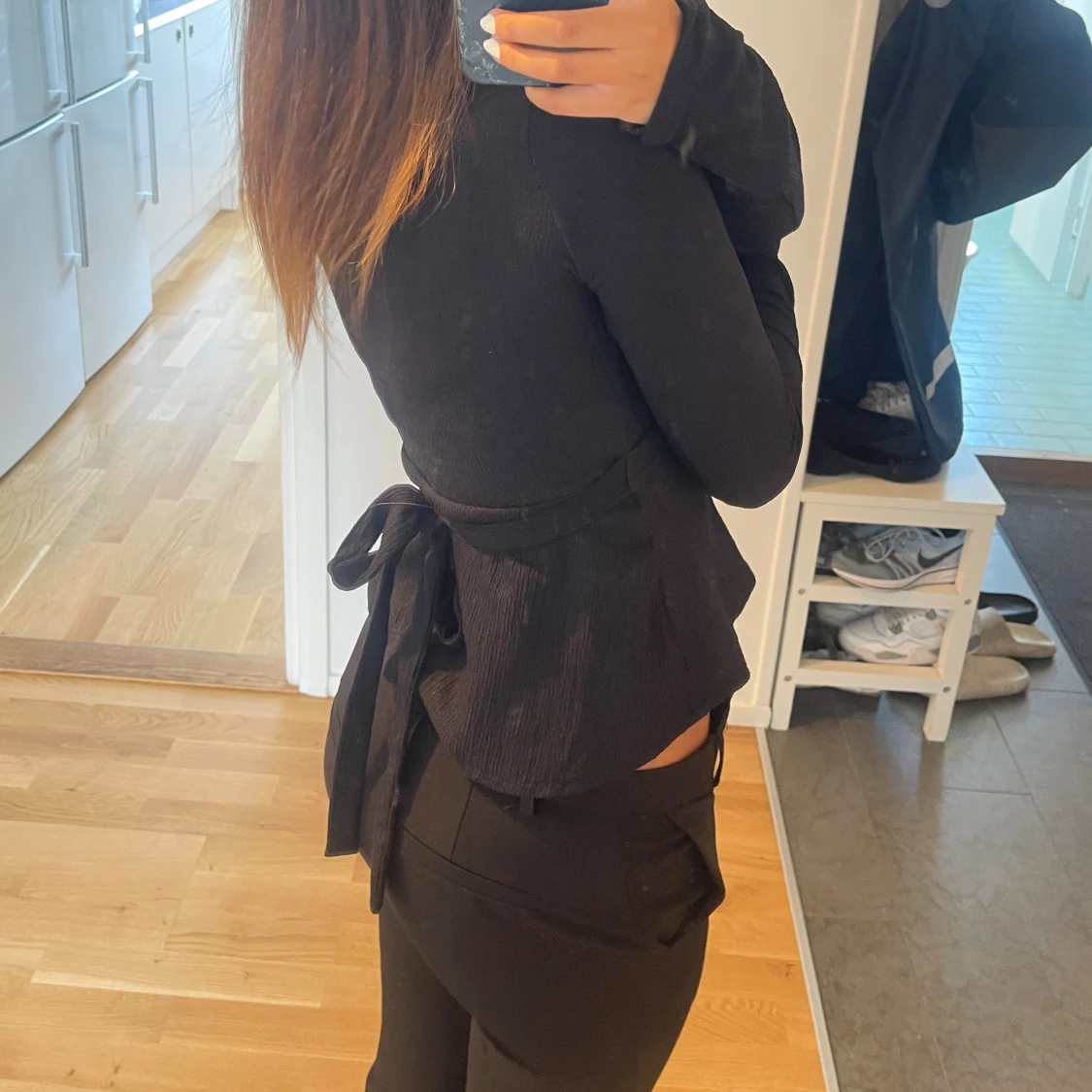 Säljer en svart omlottopp med djup v-ringning och långa ärmar. Toppen har knyt i ryggen och är tillverkad i ett lätt ribbat material som ger en snygg struktur. Perfekt för dig som gillar en stilren och trendig look.