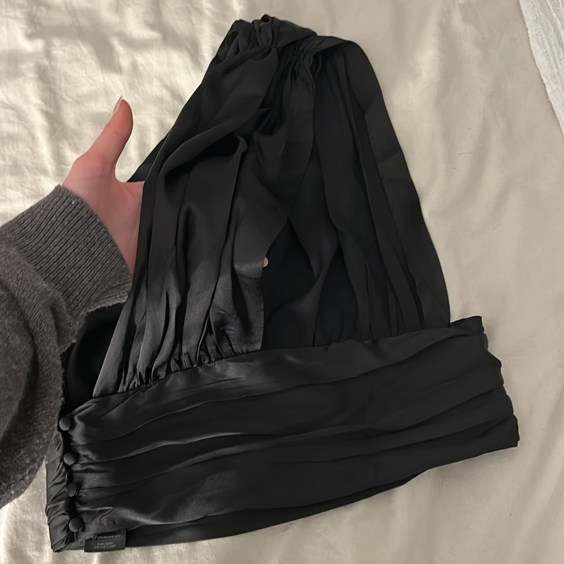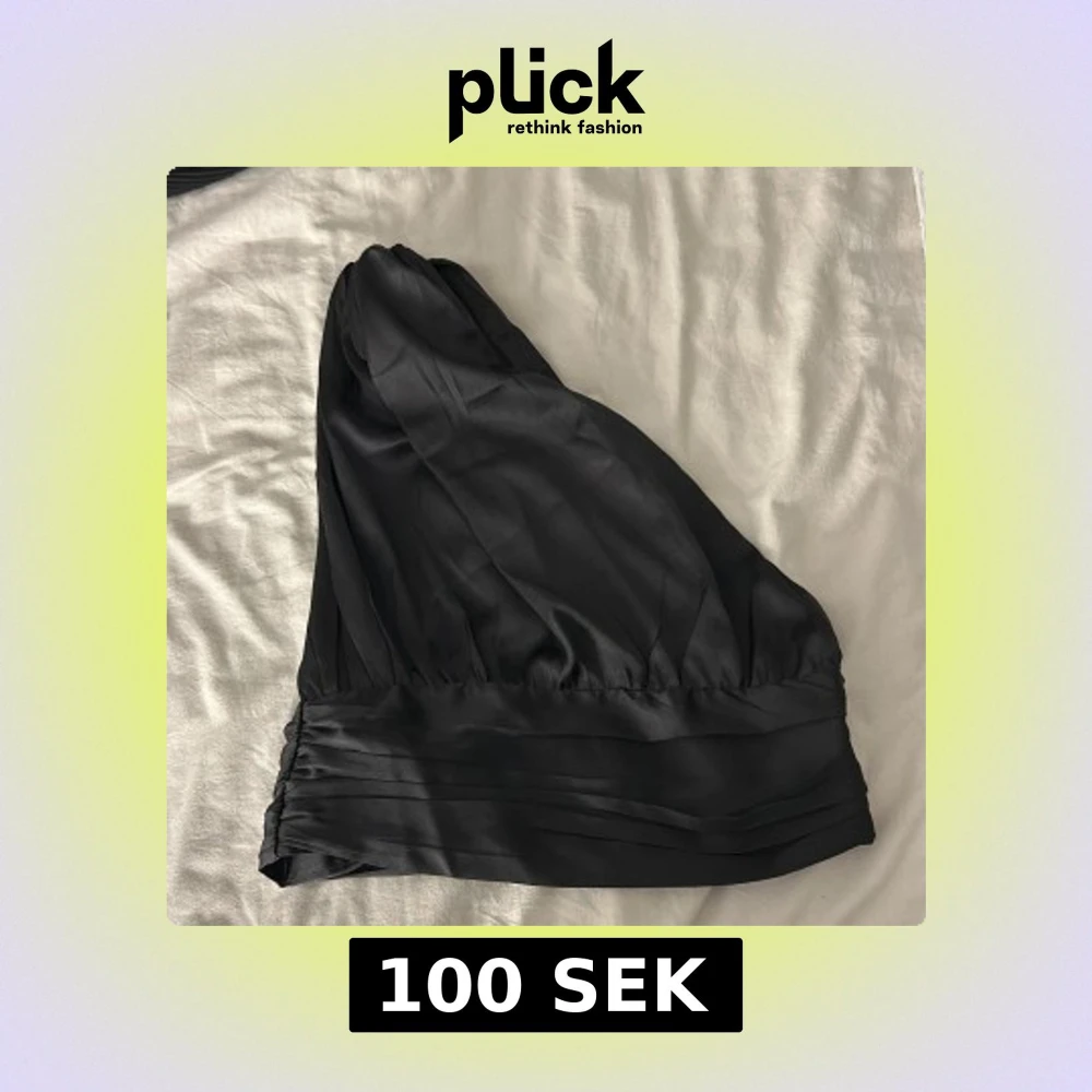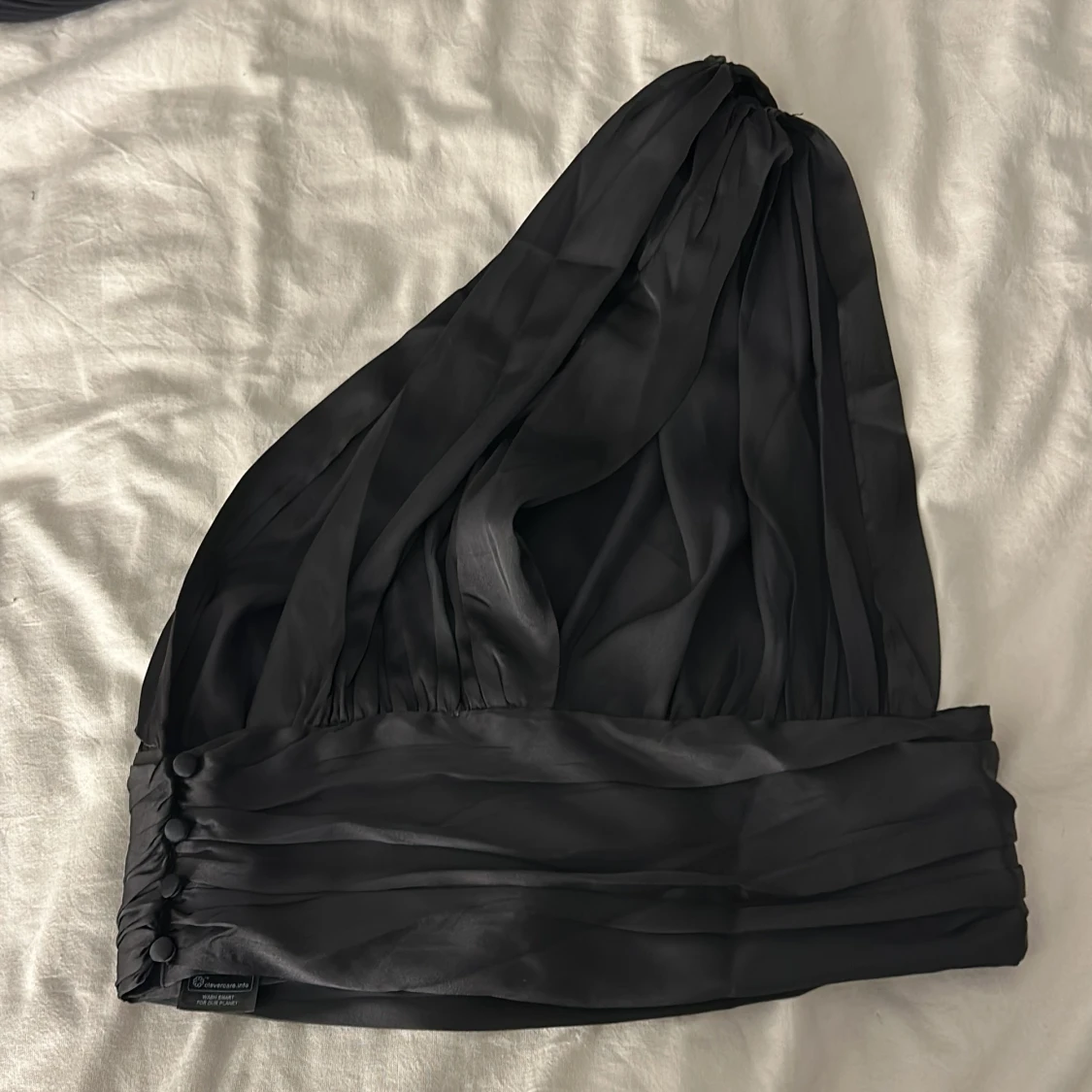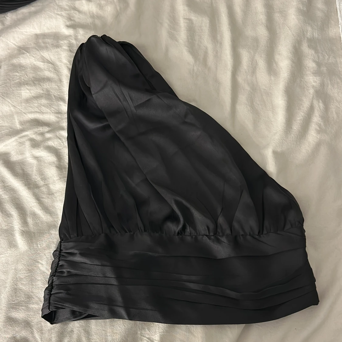 Snygg svart oneshoulder topp i satin med bred midja och veckade detaljer. Perfekt för en stilren look.
