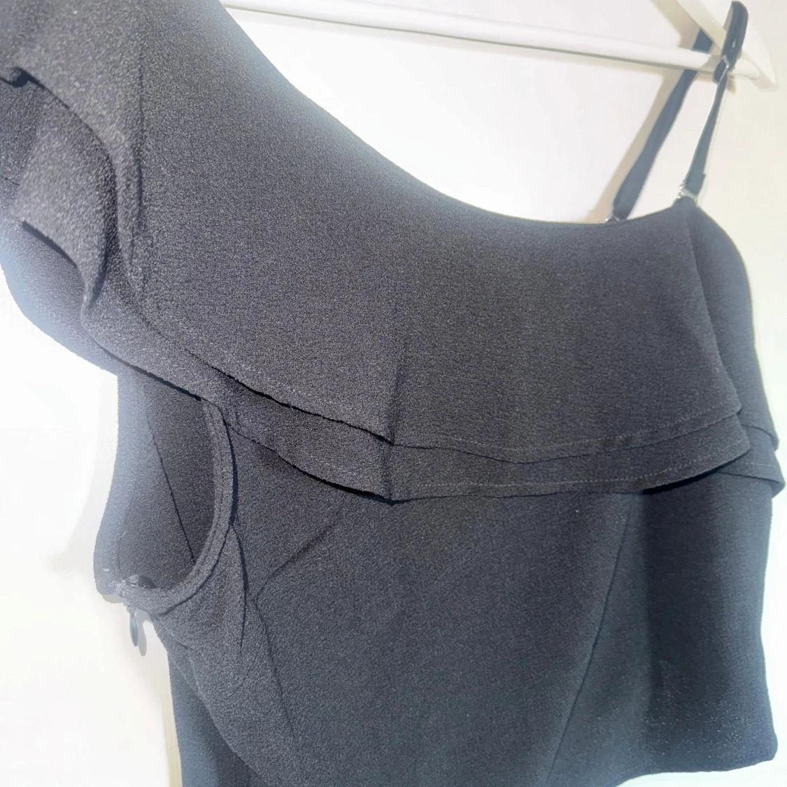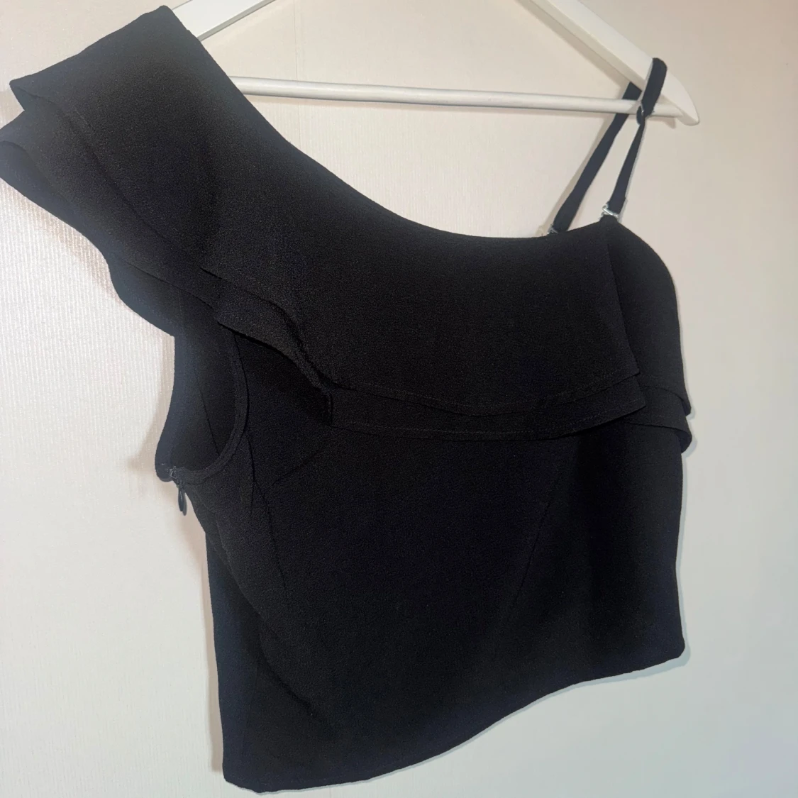 Snygg svart oneshoulder topp från Rut&Circle med volangdetalj. Perfekt för en stilren look. Toppen har en smal axelrem och är croppad för en modern stil.