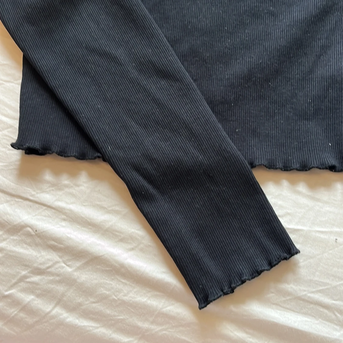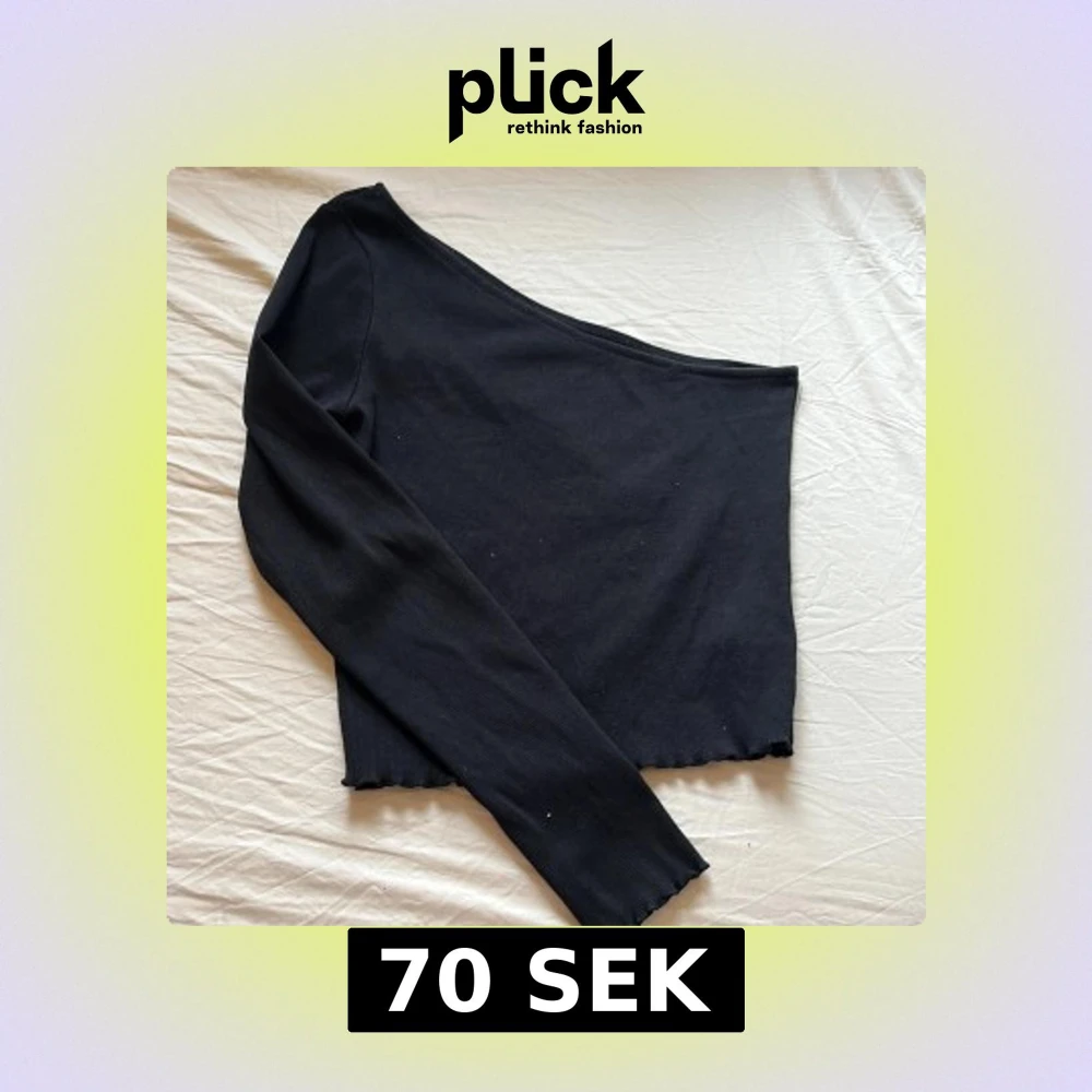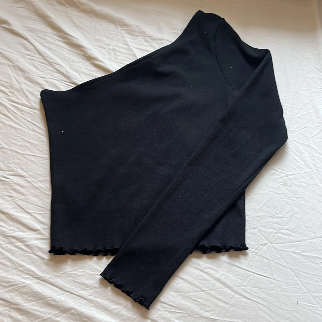 Svart ribbad oneshoulder topp från Gina Tricot i storlek S. Toppen har lång ärm på ena sidan och är croppad med vågig kant nertill. Perfekt för dig som gillar en stilren och trendig look 🖤