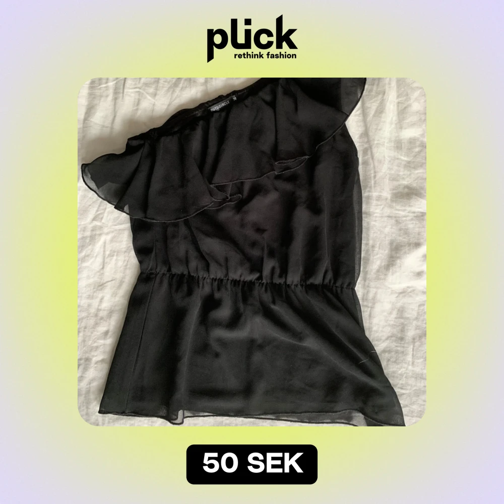 Snygg svart oneshoulder topp i ett lätt och luftigt material. Toppen har en volangdetalj över axeln som ger en extra touch av stil. Perfekt för en utekväll eller fest! 🖤