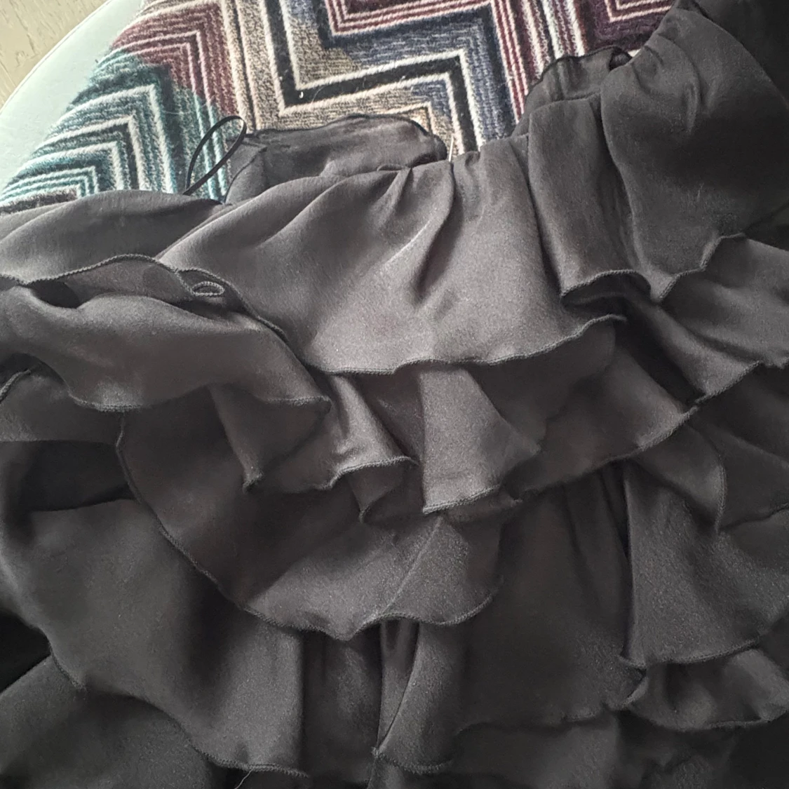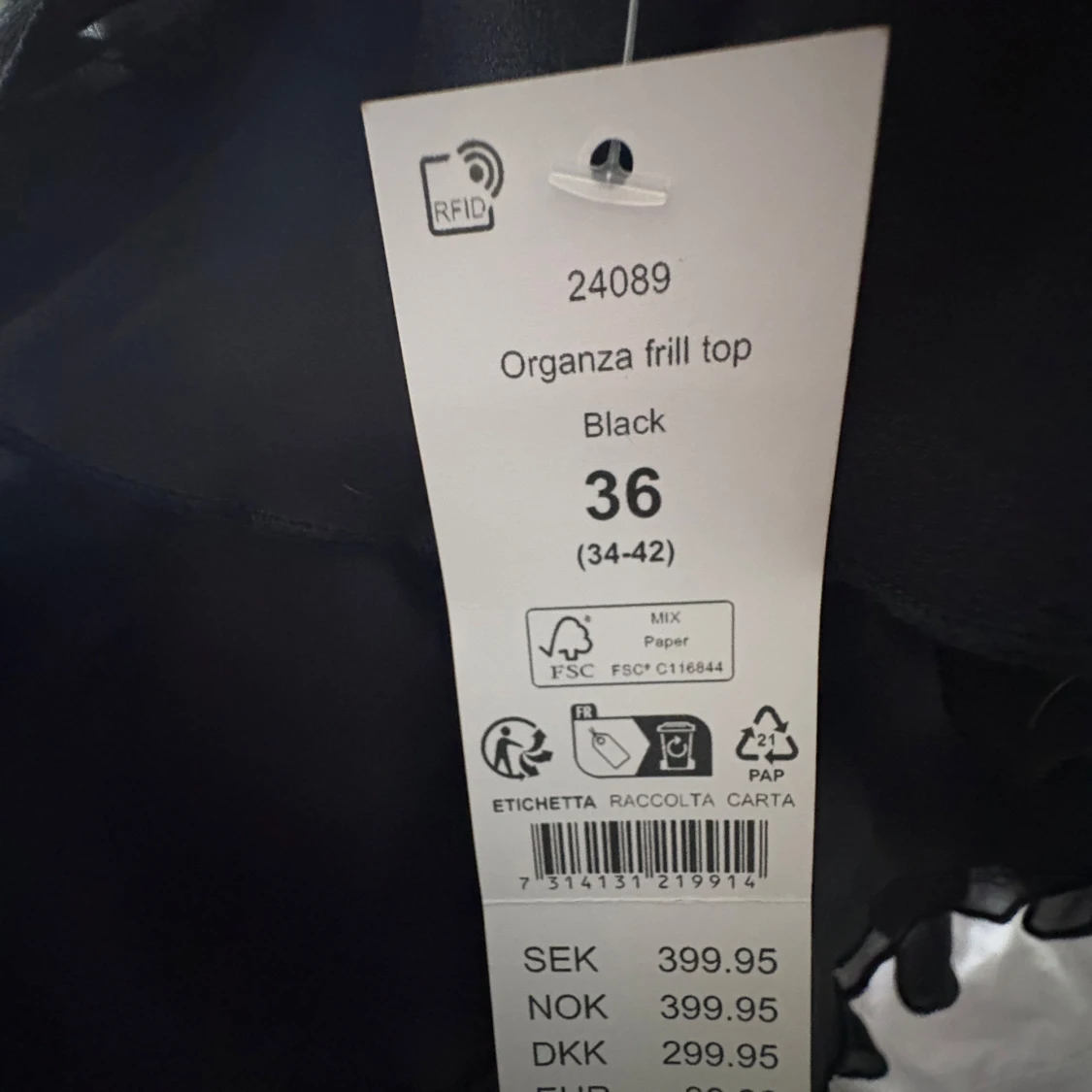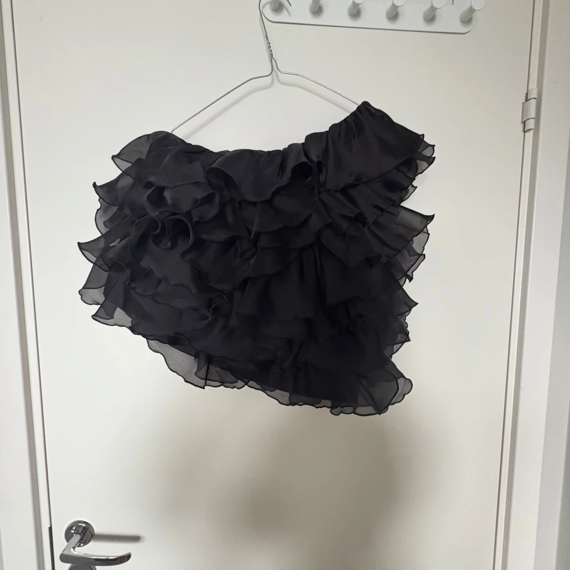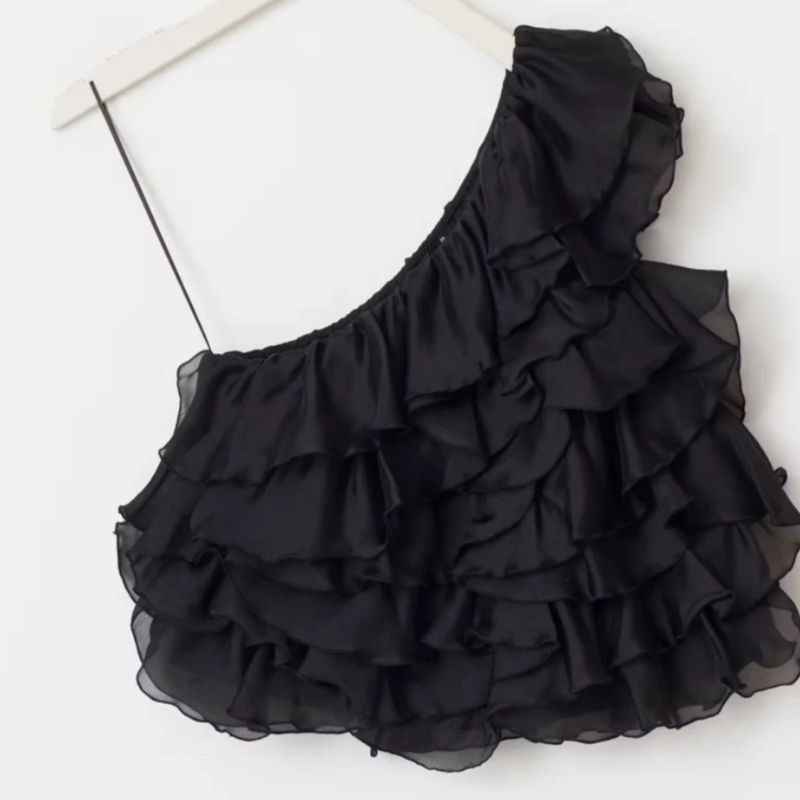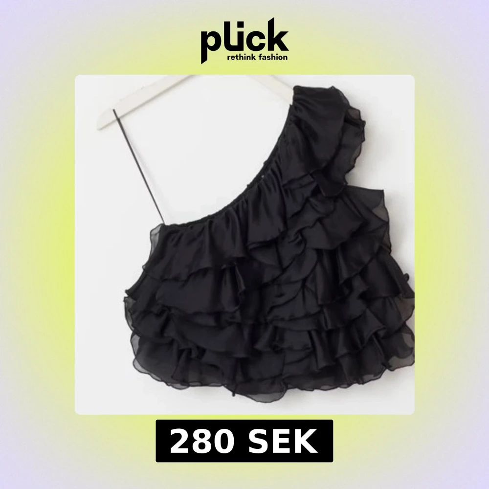Supersnygg svart topp med volanger och one shoulder-design. Tunt och lätt material som ger en luftig känsla. Perfekt för dig som vill sticka ut med en trendig och cool look. Volangerna ger extra attityd och toppen har en smal axelrem.