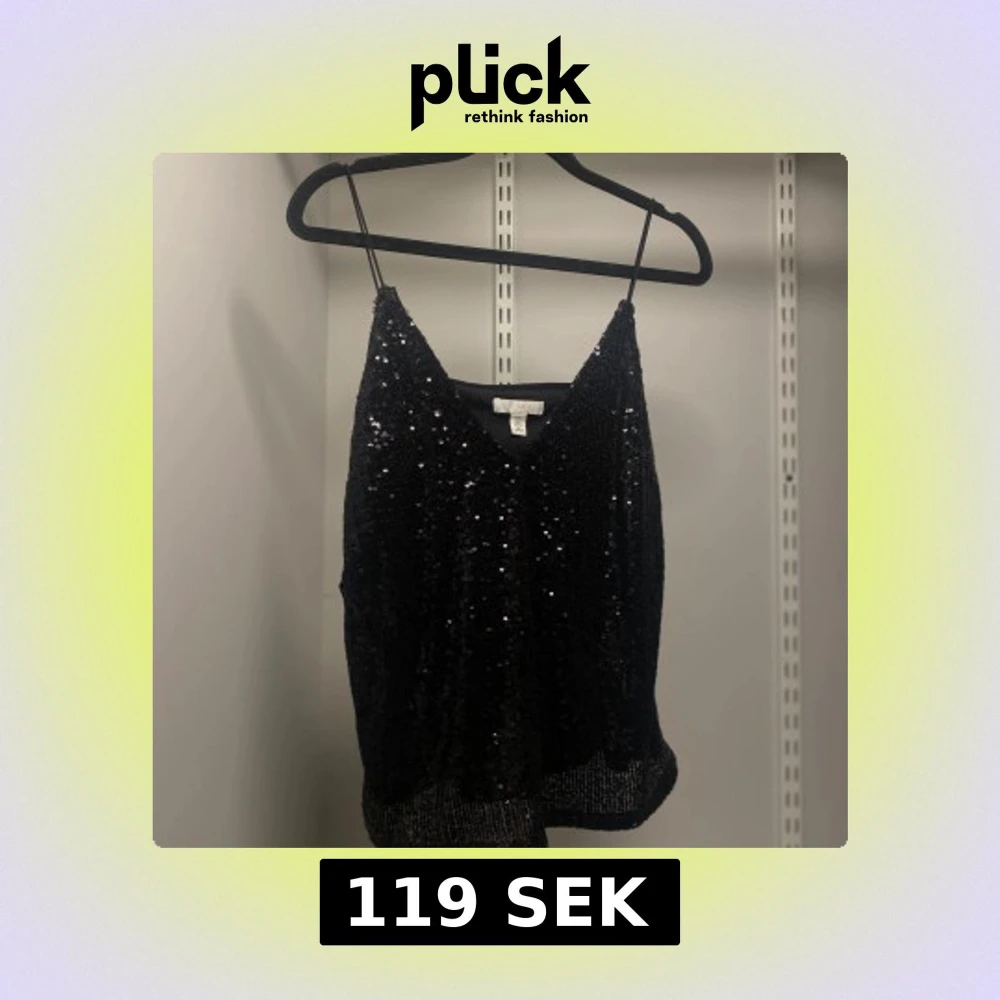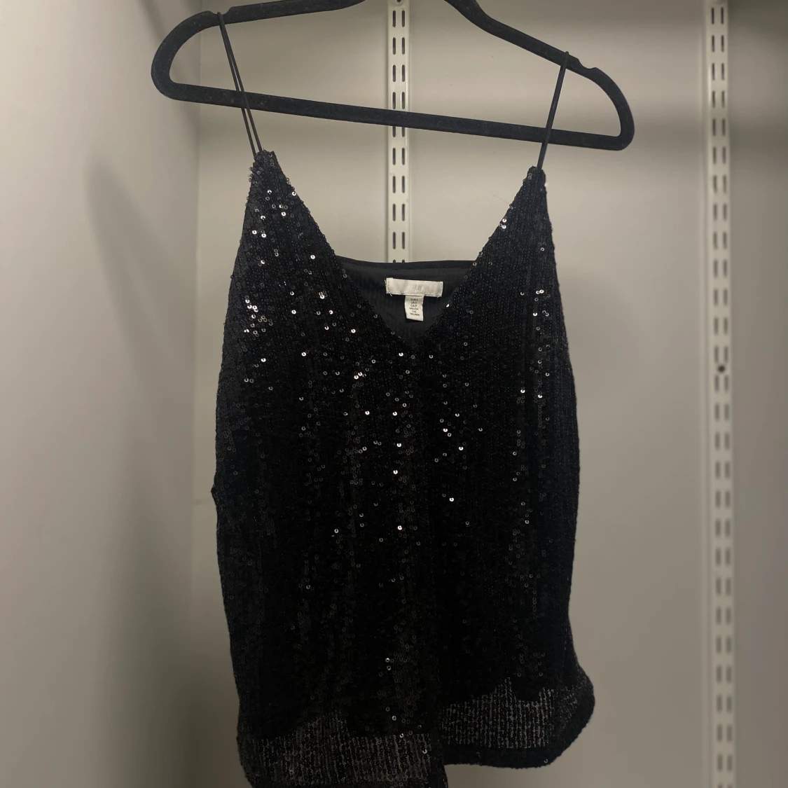 Snyggt svart linne med paljetter som ger en glittrig look. Perfekt för en utekväll eller fest. Axelbandslös design med en elegant passform. Från hm, storlek xs.