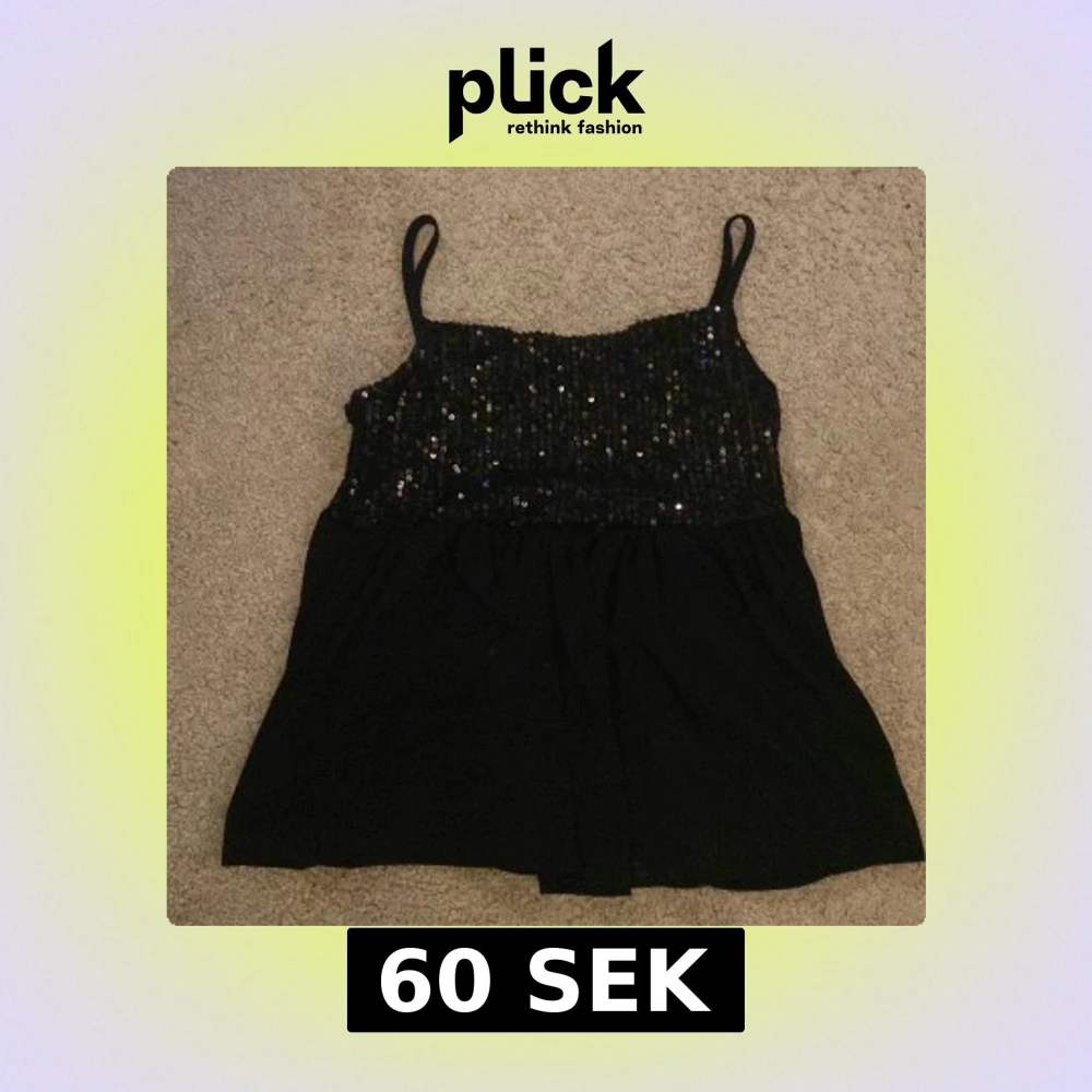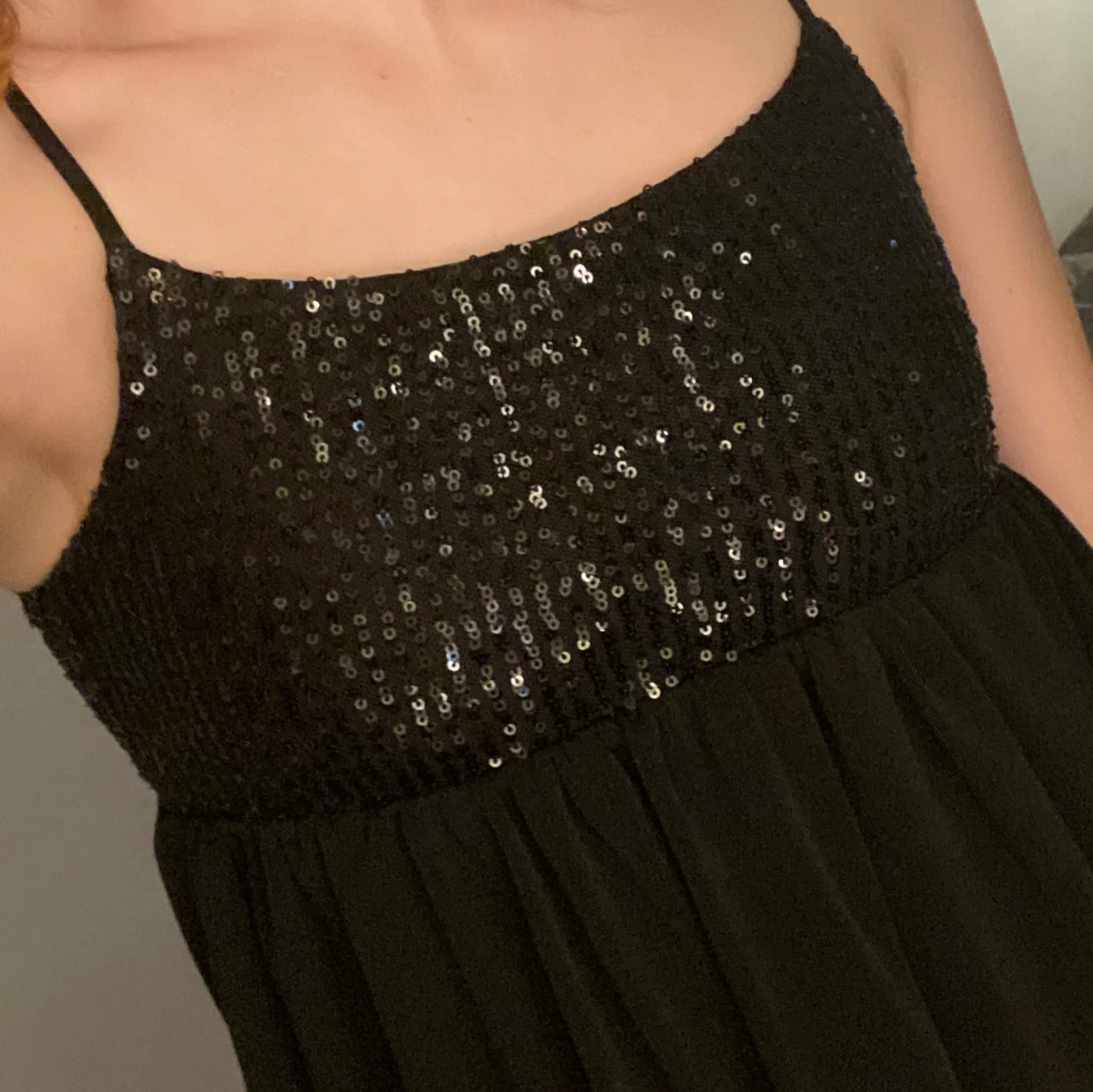Snyggt svart linne från Gina Tricot med glittriga paljetter på överdelen. Linnet har smala axelband och en luftig passform. Säljer för att jag har växt ur den.