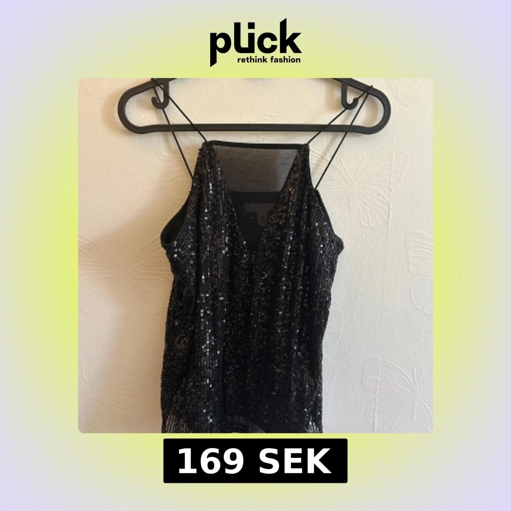 Glittrig svart linnetopp med tunna axelband och v-ringning. Hela toppen är täckt av svarta paljetter som ger en riktigt snygg partykänsla. Sitter löst och har en lätt croppad look. Perfekt att styla med jeans eller kjol för en extra glammig outfit.