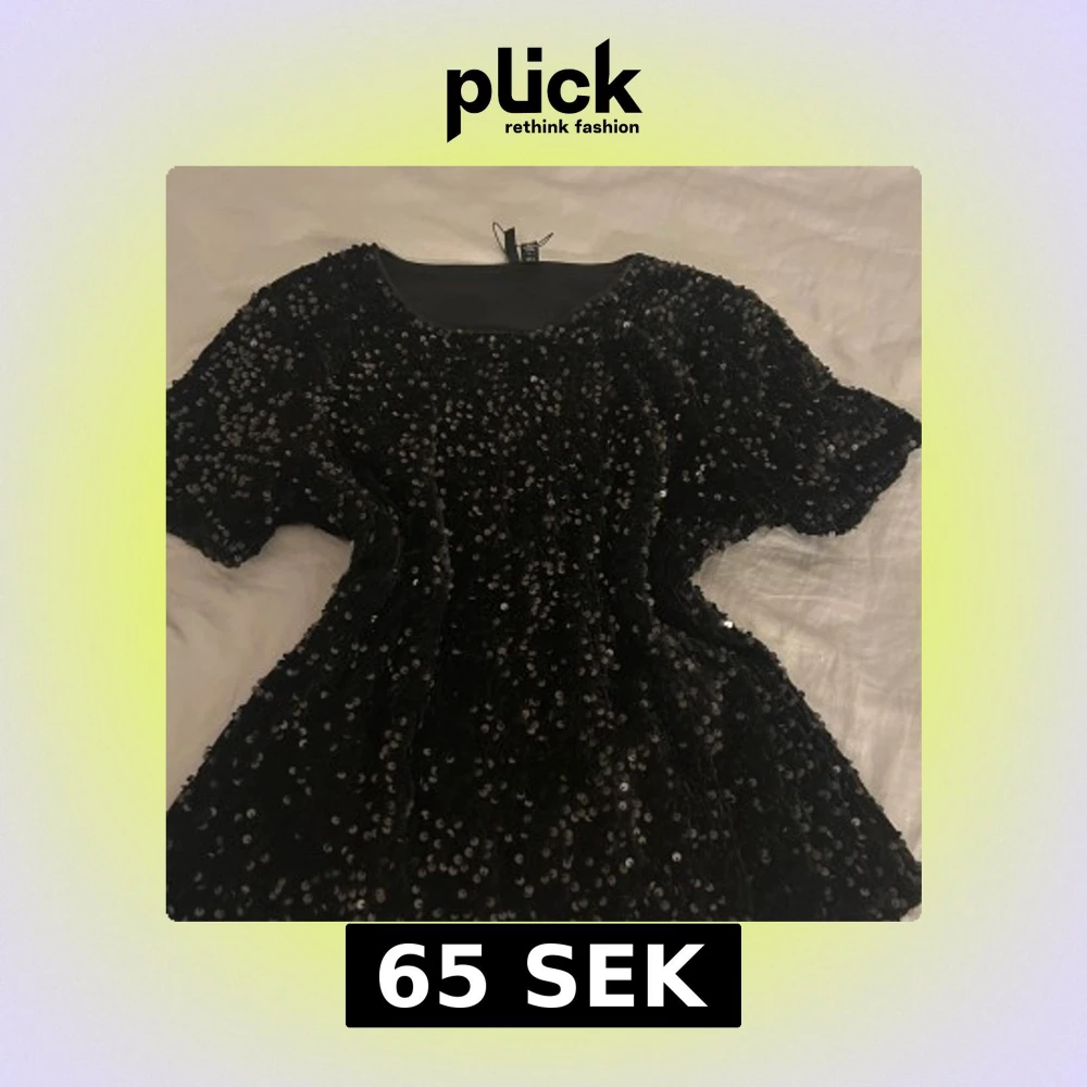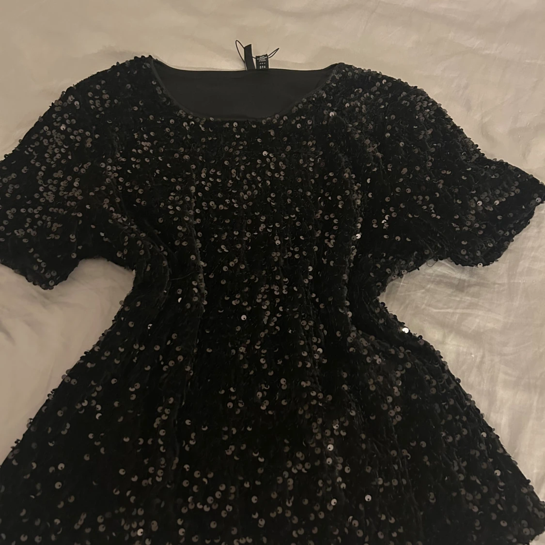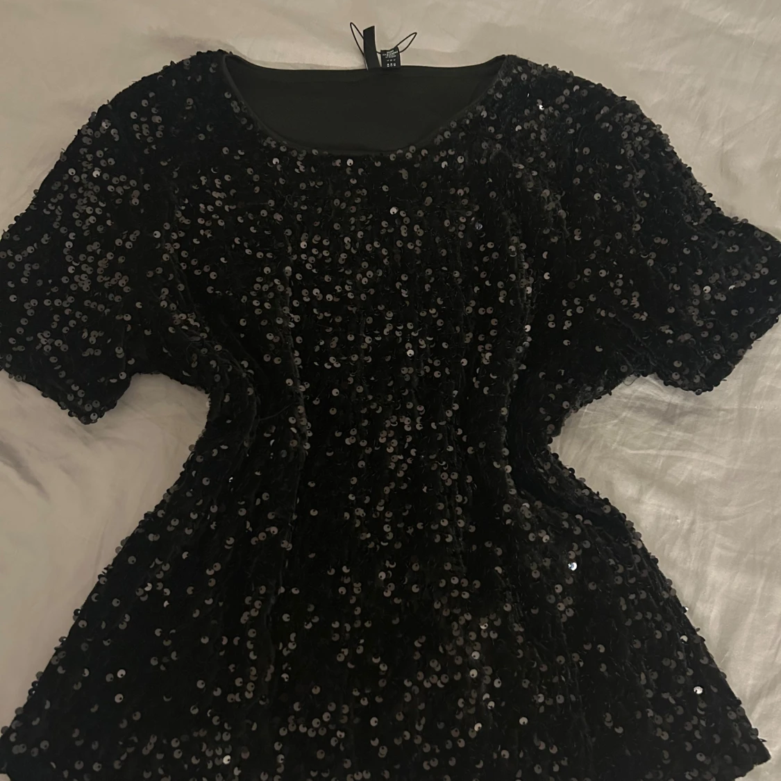 Säljer en svart topp från H&M som är täckt med glittrande paljetter. Toppen har rund halsringning och korta ärmar, perfekt för att sticka ut. Materialet är mjukt och följsamt med en snygg glansig finish.