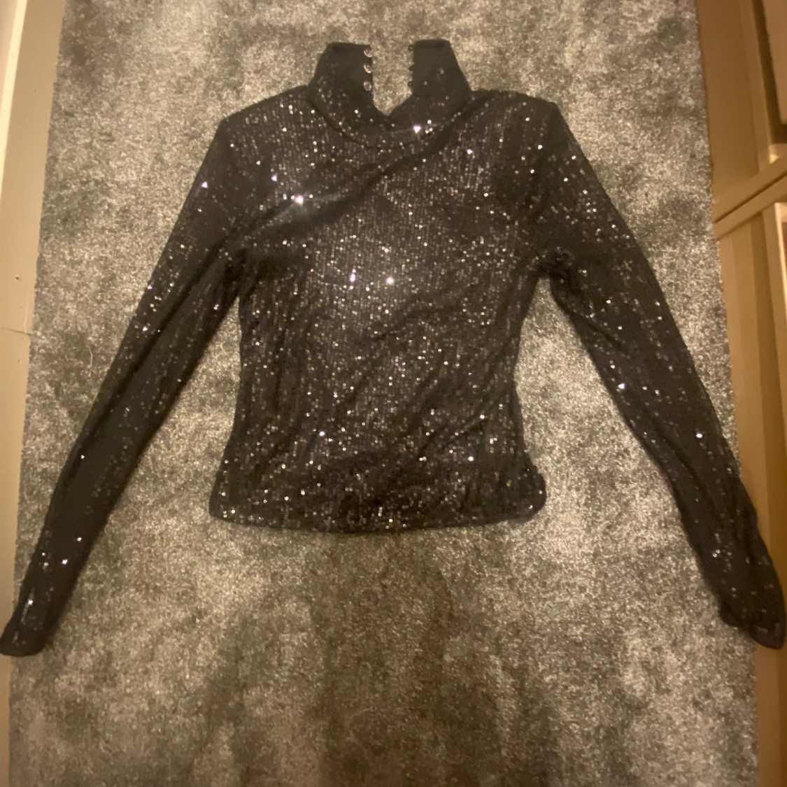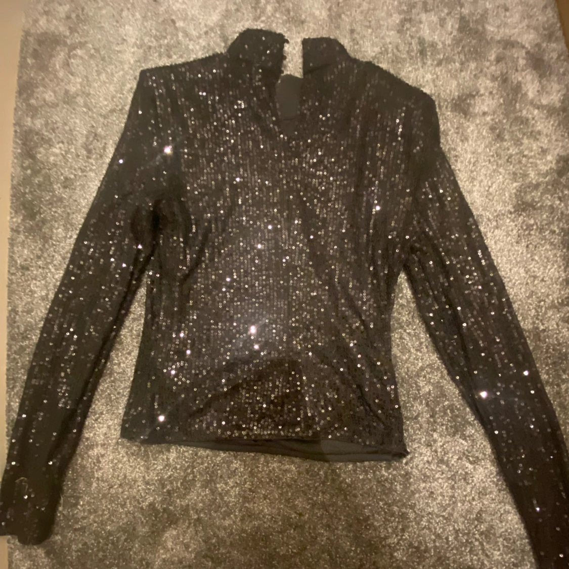 Glittrig svart topp från NA-KD med lång ärm och hög krage. Toppens yta är täckt av paljetter som ger en riktigt festlig look. Stängs med knappar i nacken och har en figurnära passform. Perfekt för fester!!⭐️⭐️