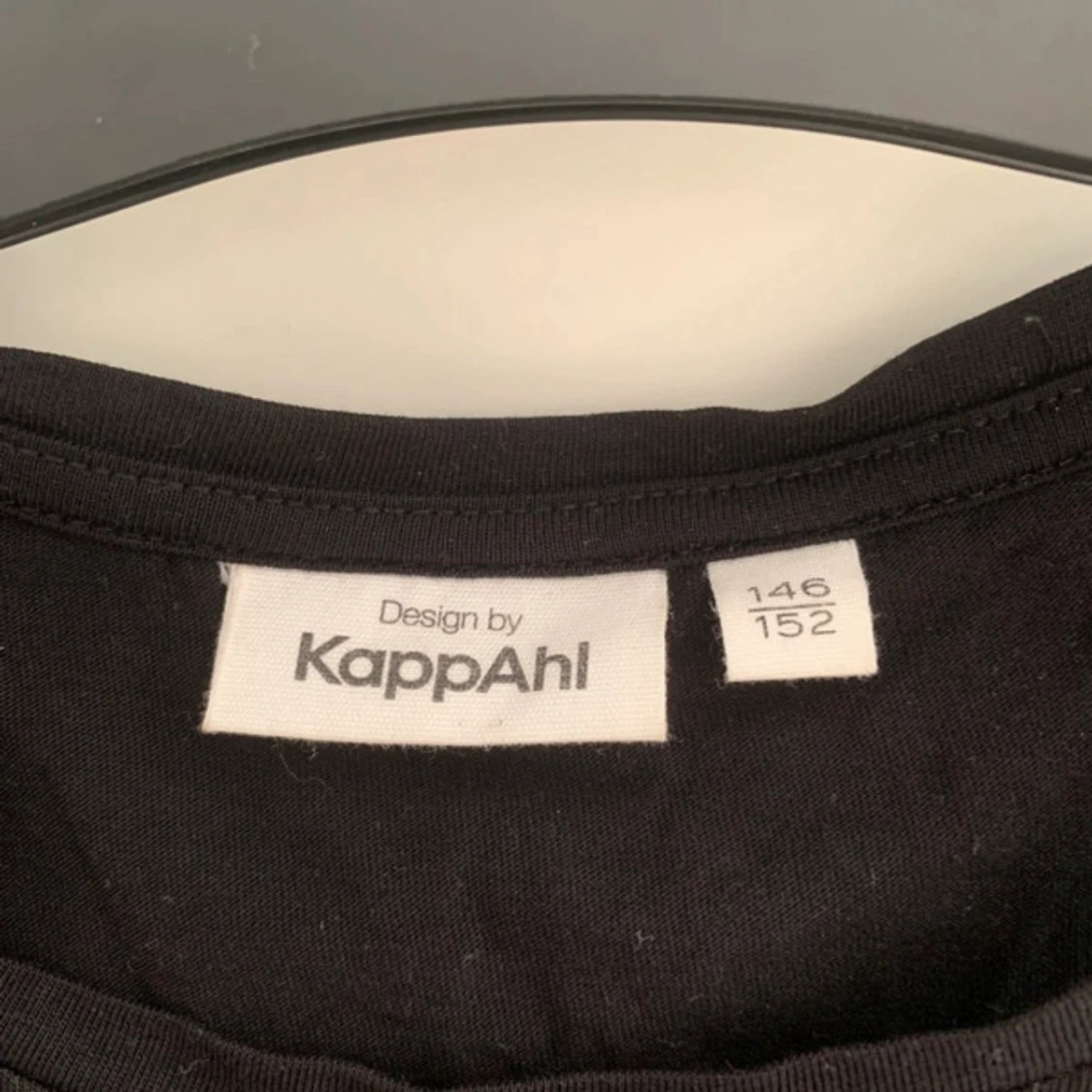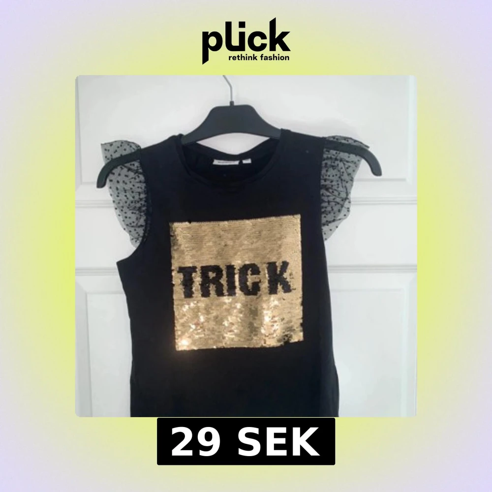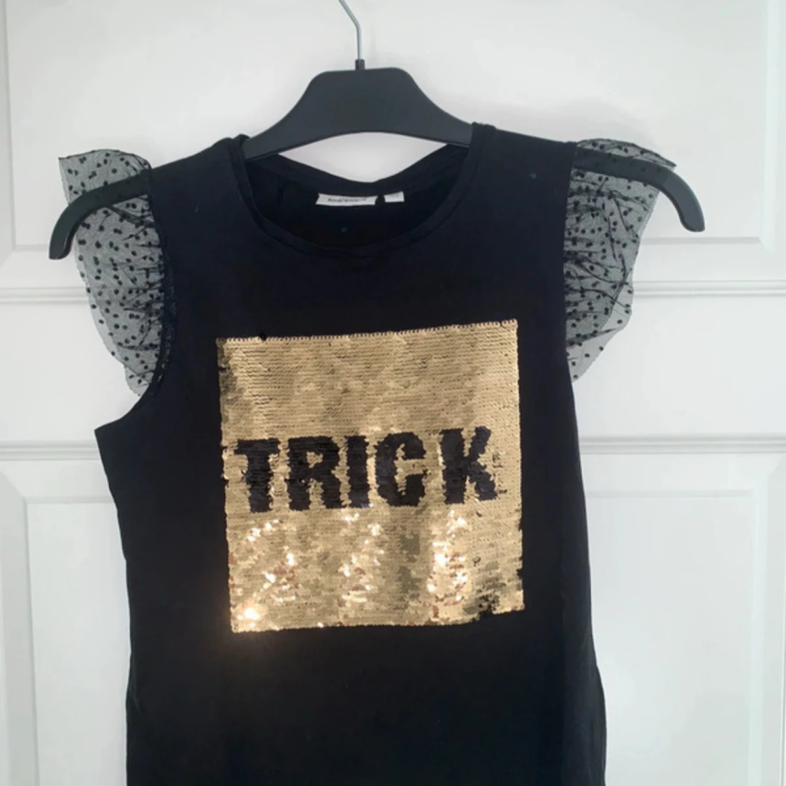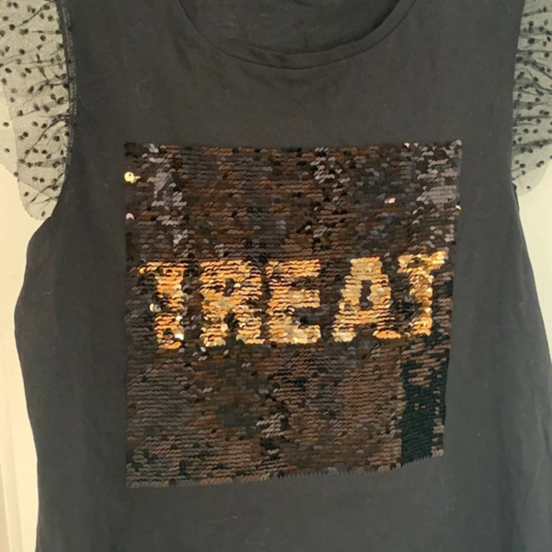 Cool svart topp från KappAhl med vändbara paljetter framtill som visar texten 'TRICK' eller 'TREAT' i guld och svart. Puffiga ärmlösa axlar i transparent mesh med svarta prickar ger en extra festlig touch. Perfekt för halloween eller när du vill sticka ut.