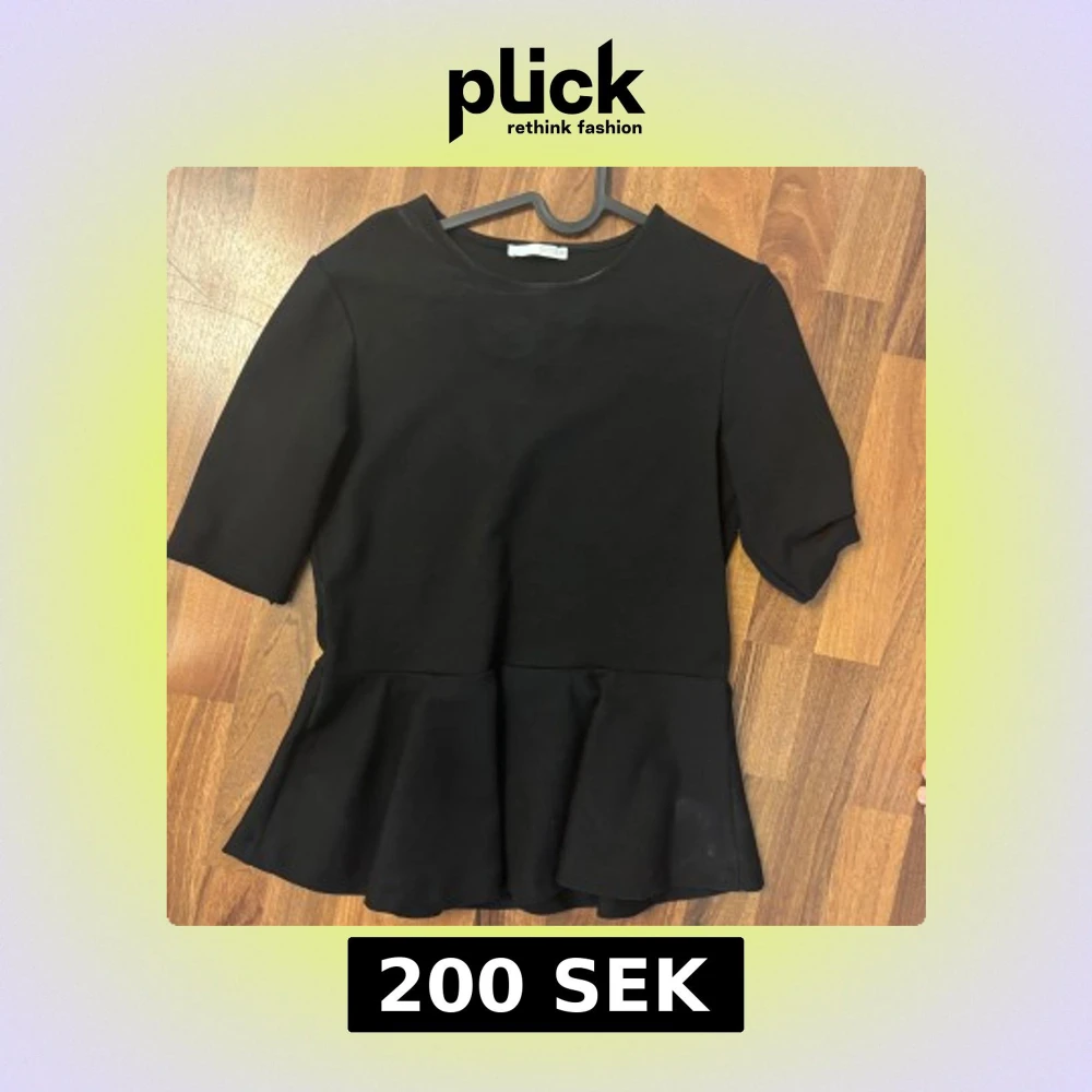 En stilren svart topp med peplumvolang nedtill och halvlånga ärmar. Toppen har rund halsringning och är sydd i ett mjukt, lite stretchigt material som ger en snygg passform. Perfekt för dig som gillar enkel men trendig stil.