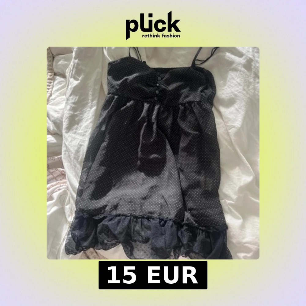 Svart kortklänning/top med tunna axelband, små vita prickar och dekorativa knappar framtill. Kjolen har ett lager av transparent volang längst ner som ger en extra touch. Perfekt för dig som gillar en söt och lekfull stil. ”Vintage h&m”🥰🥰