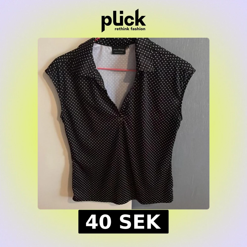 Snygg svart blus med vita prickar från Func Factory. Modellen har krage, korta ärmar och en figurnära passform. Perfekt för dig som gillar retrovibbar och vill sticka ut med ett klassiskt mönster.