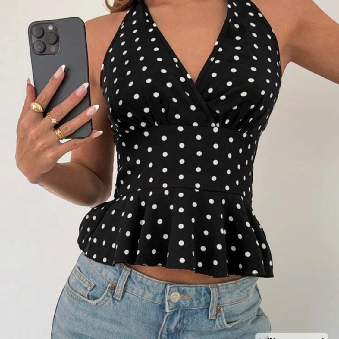 Svart halterneck topp med vita prickar och volang nertill. Toppen har omlott-skärning framtill och knyts i nacken. Perfekt för dig som gillar retrostil och vill ha något som sticker ut.