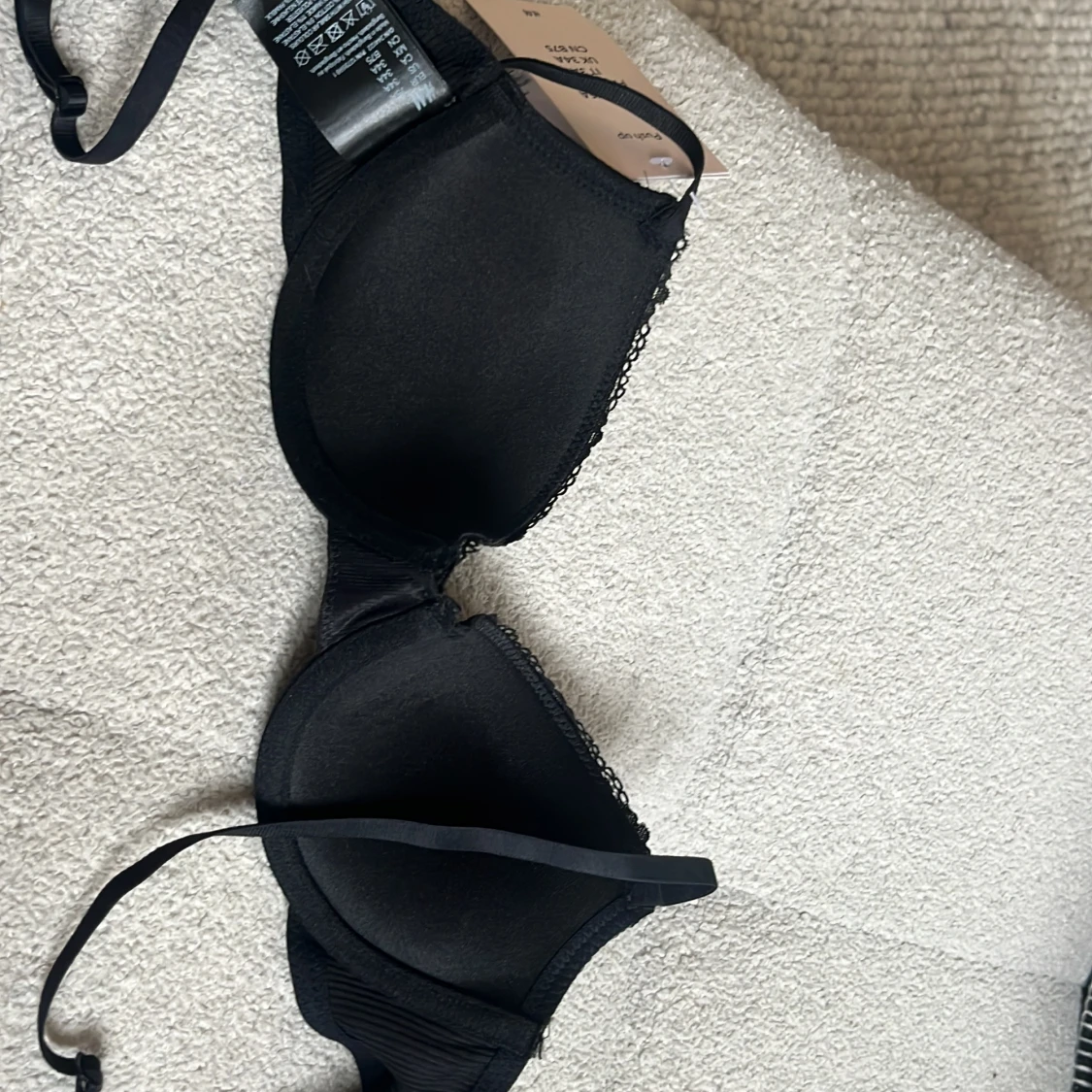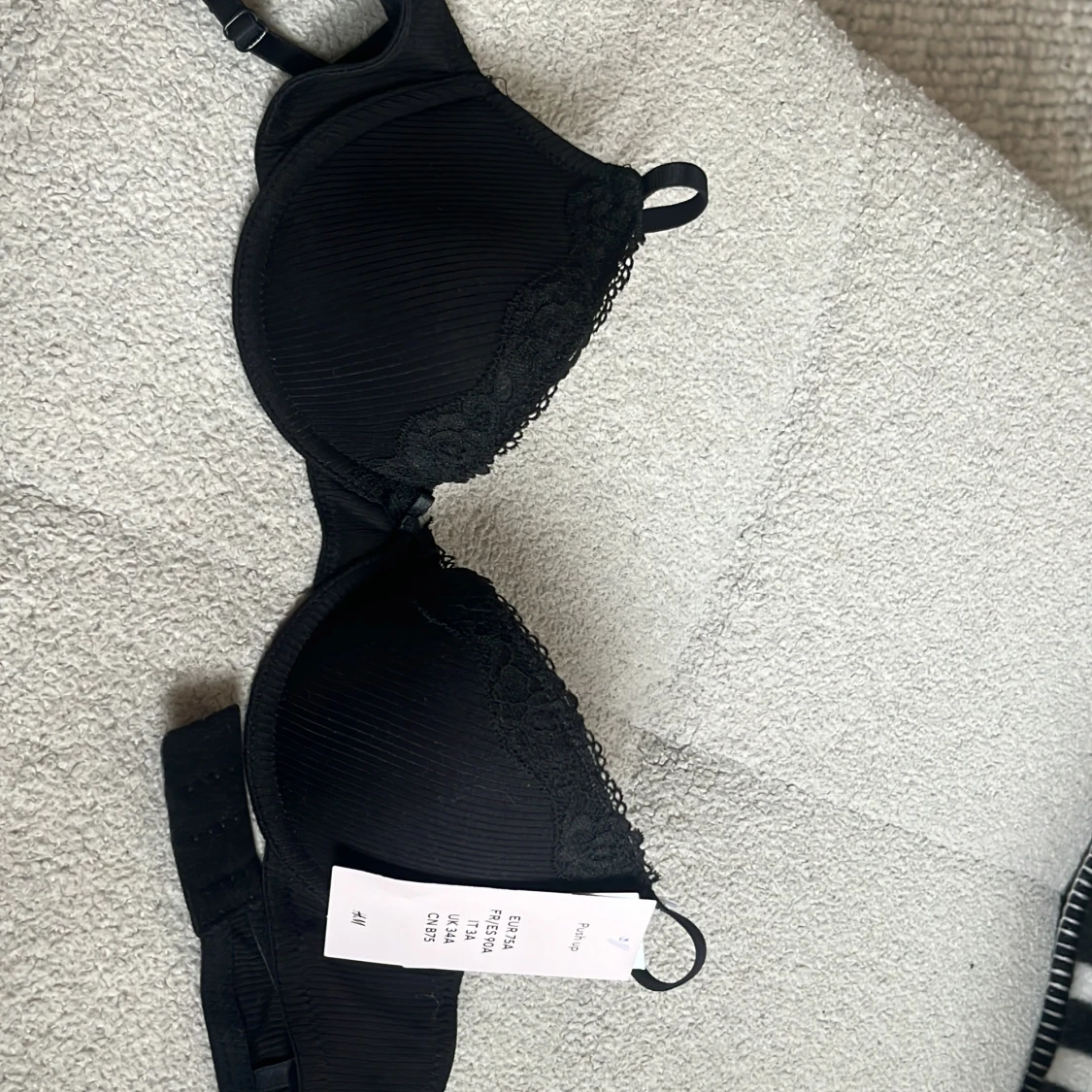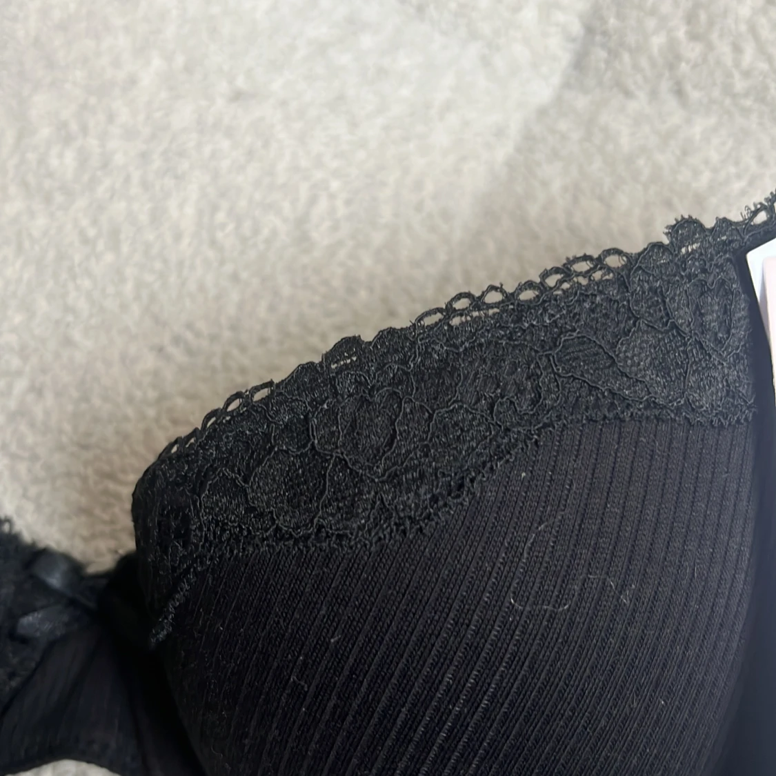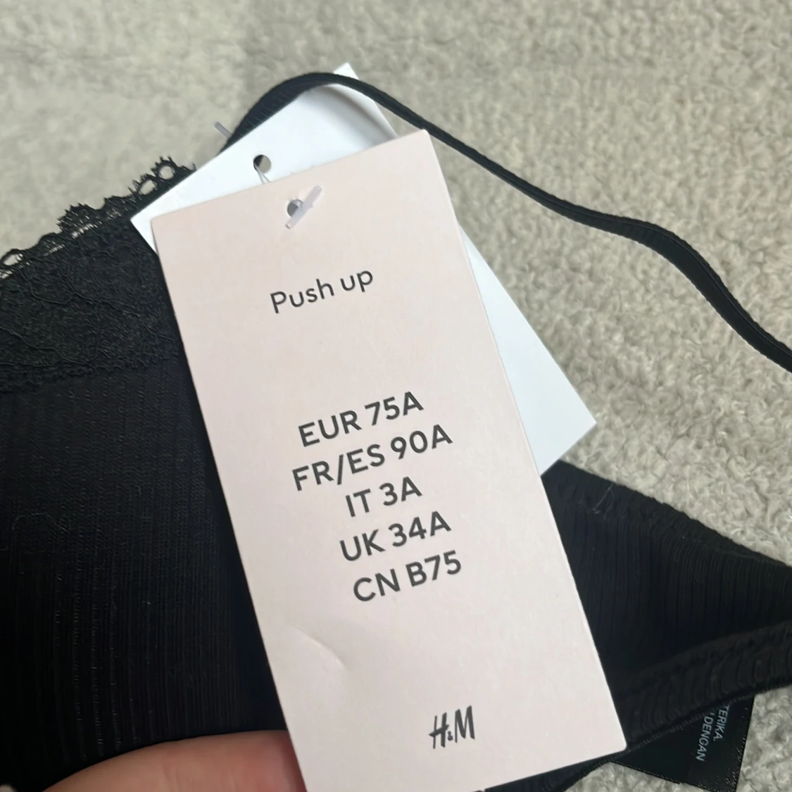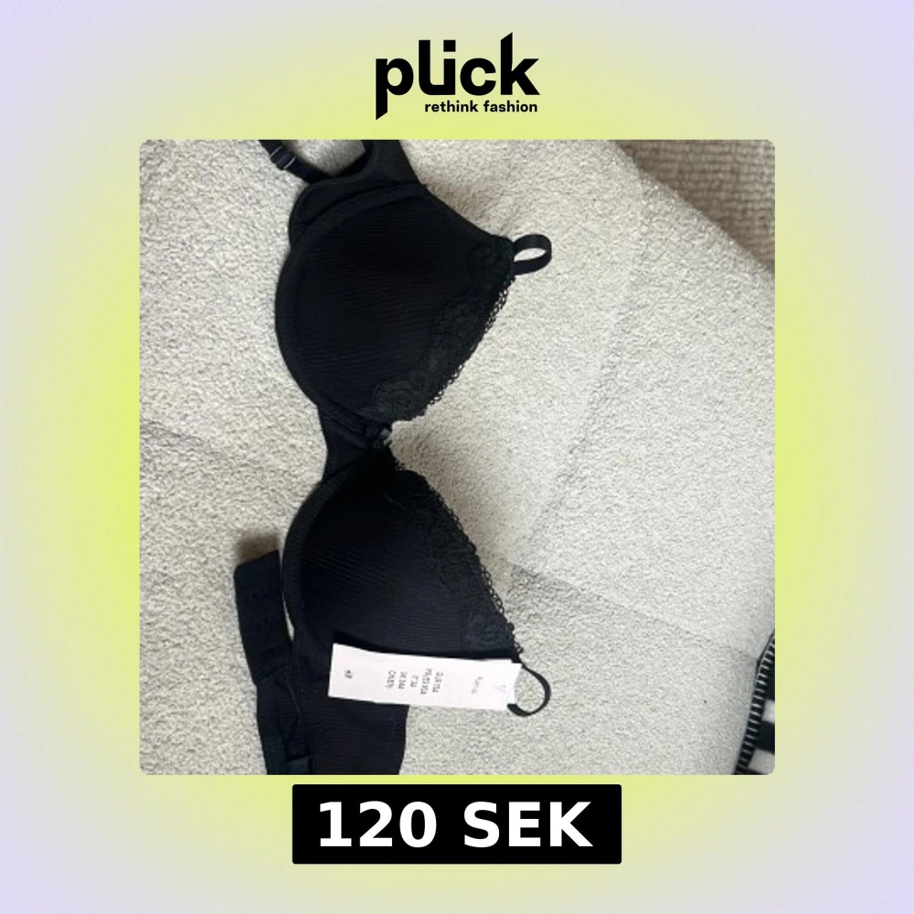 Säljer en svart push up-bh från H&M med fina spetsdetaljer längs kuporna och en liten rosett framtill. Bh:n har justerbara axelband och slät baksida. Perfekt för dig som vill ha extra lyft och snygg passform.Aldrig använd