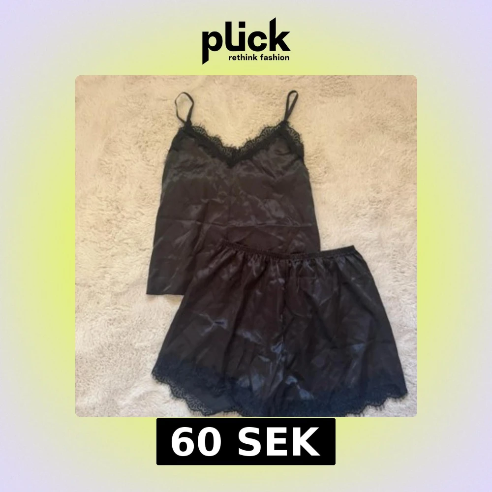 Säljer en svart pyjamas med tunna axelband och vacker spets längs urringningen. Toppen är i glansigt material som ger en lyxig känsla och passar perfekt till mysiga hemmakvällar!