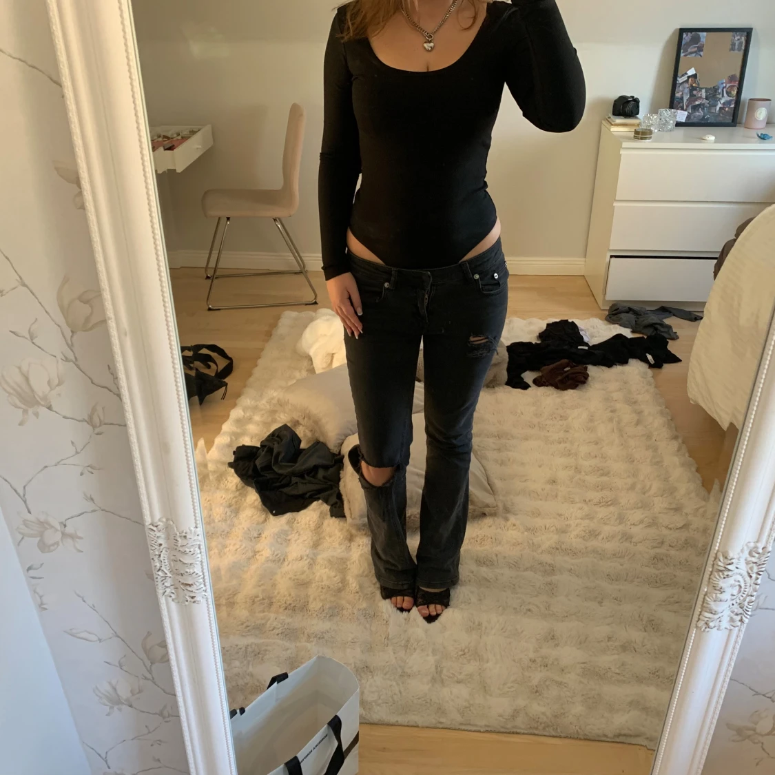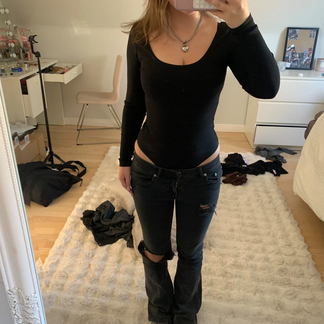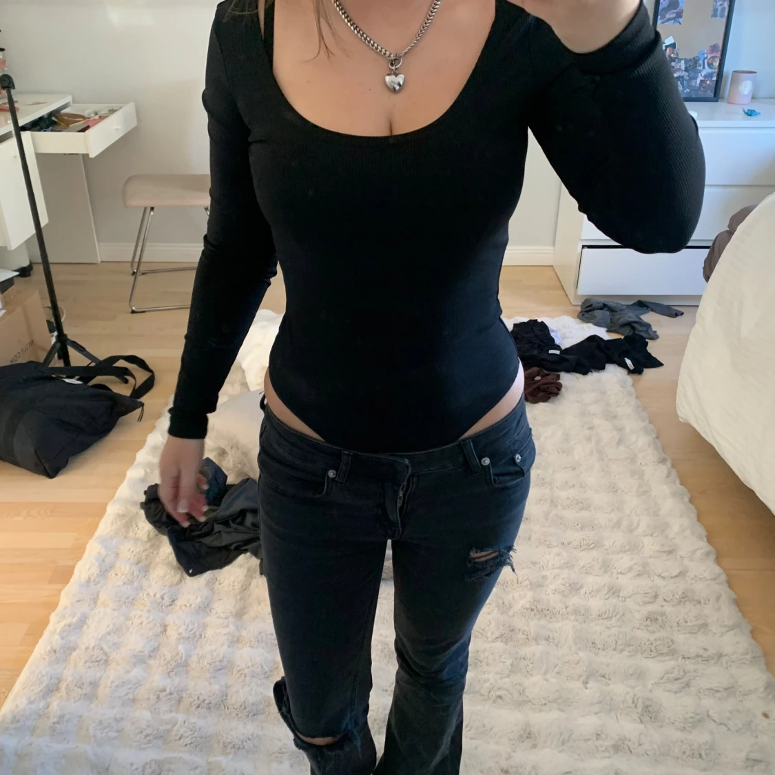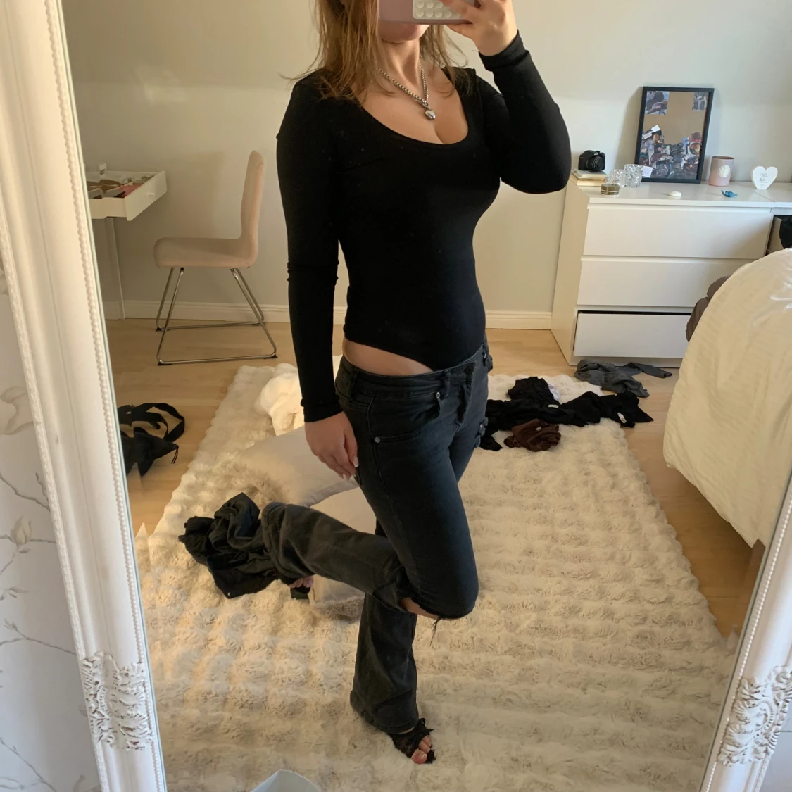 Säljer en svart, tight och ribbad långärmad topp med rundad urringning. Toppen är figurnära och har en enkel, stilren look som passar till mycket. Materialet är stretchigt och bekvämt, perfekt för dig som gillar en clean och snygg stil.