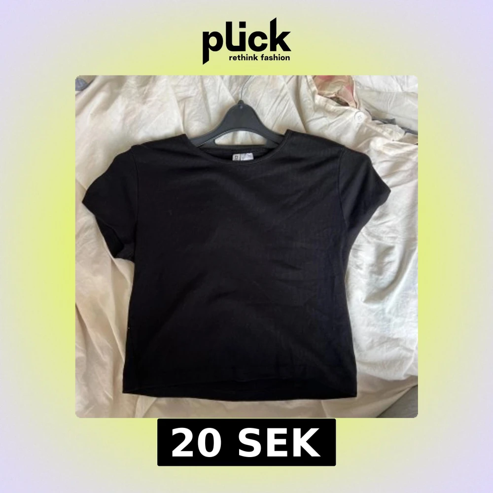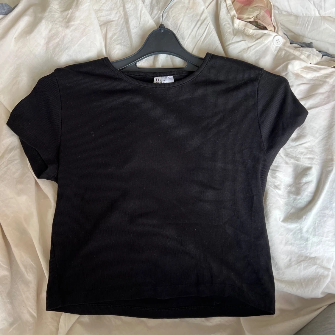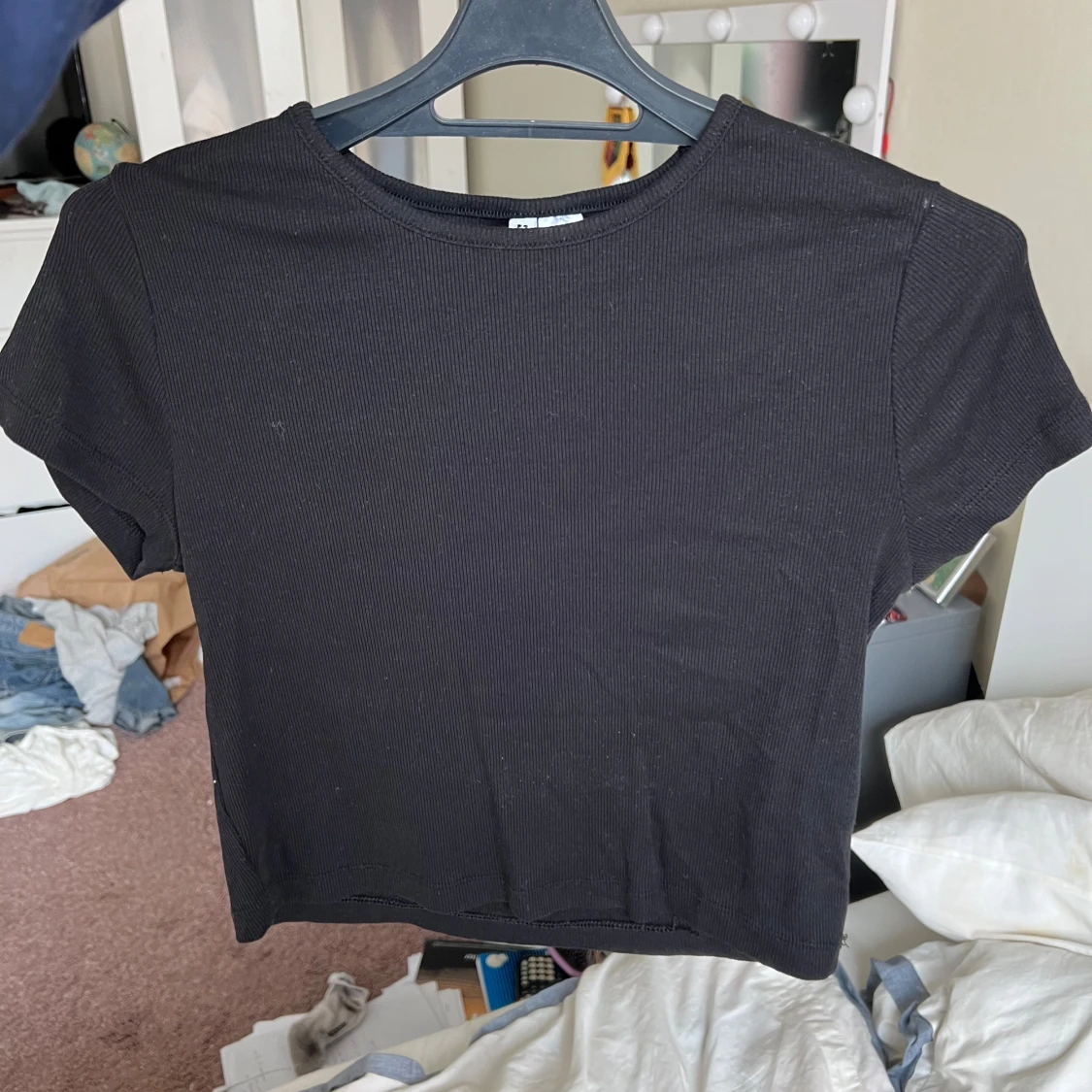 En enkel svart croppad t-shirt med ribbad struktur och korta ärmar. Perfekt basplagg som passar till mycket. Rund halsringning och mjukt material.