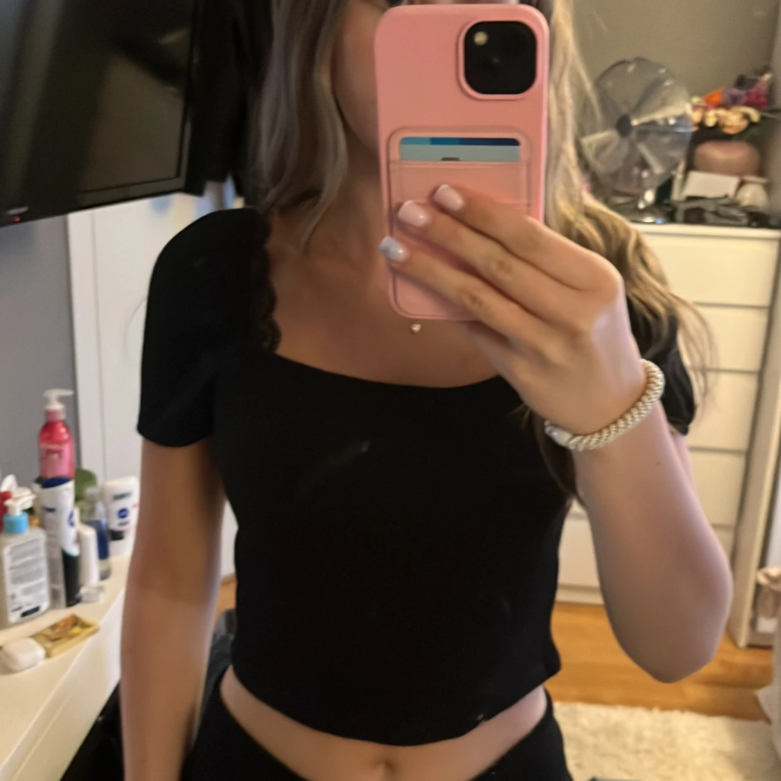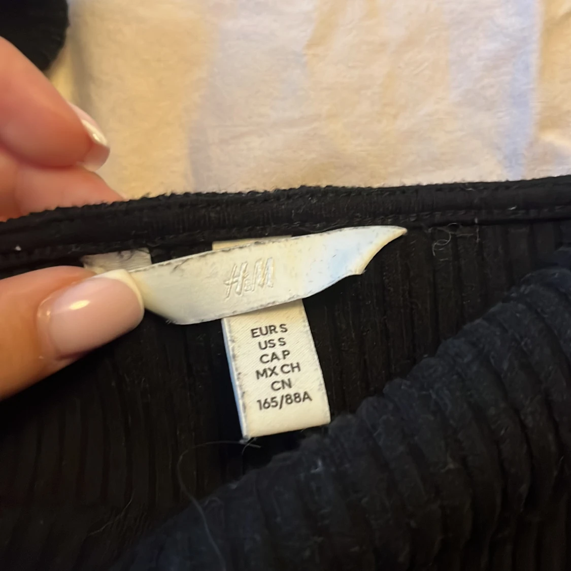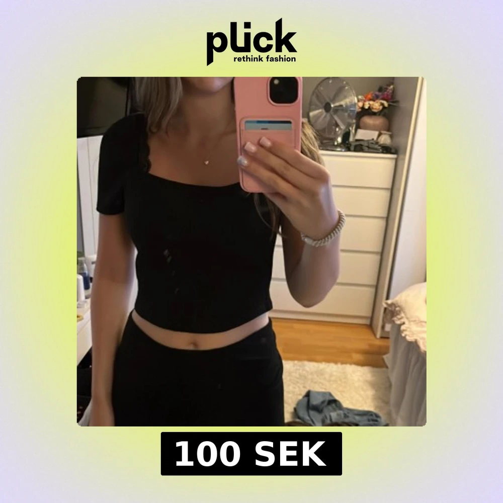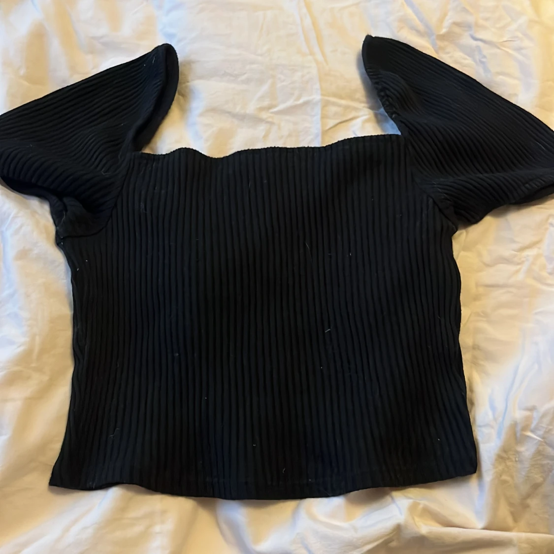 Svart croppad topp från H&M med ribbad struktur och korta ärmar. Toppen har en fyrkantig ringning och sitter snyggt figurnära. Perfekt att matcha med höga jeans eller kjol för en clean look.