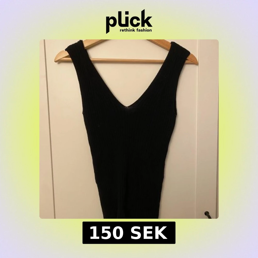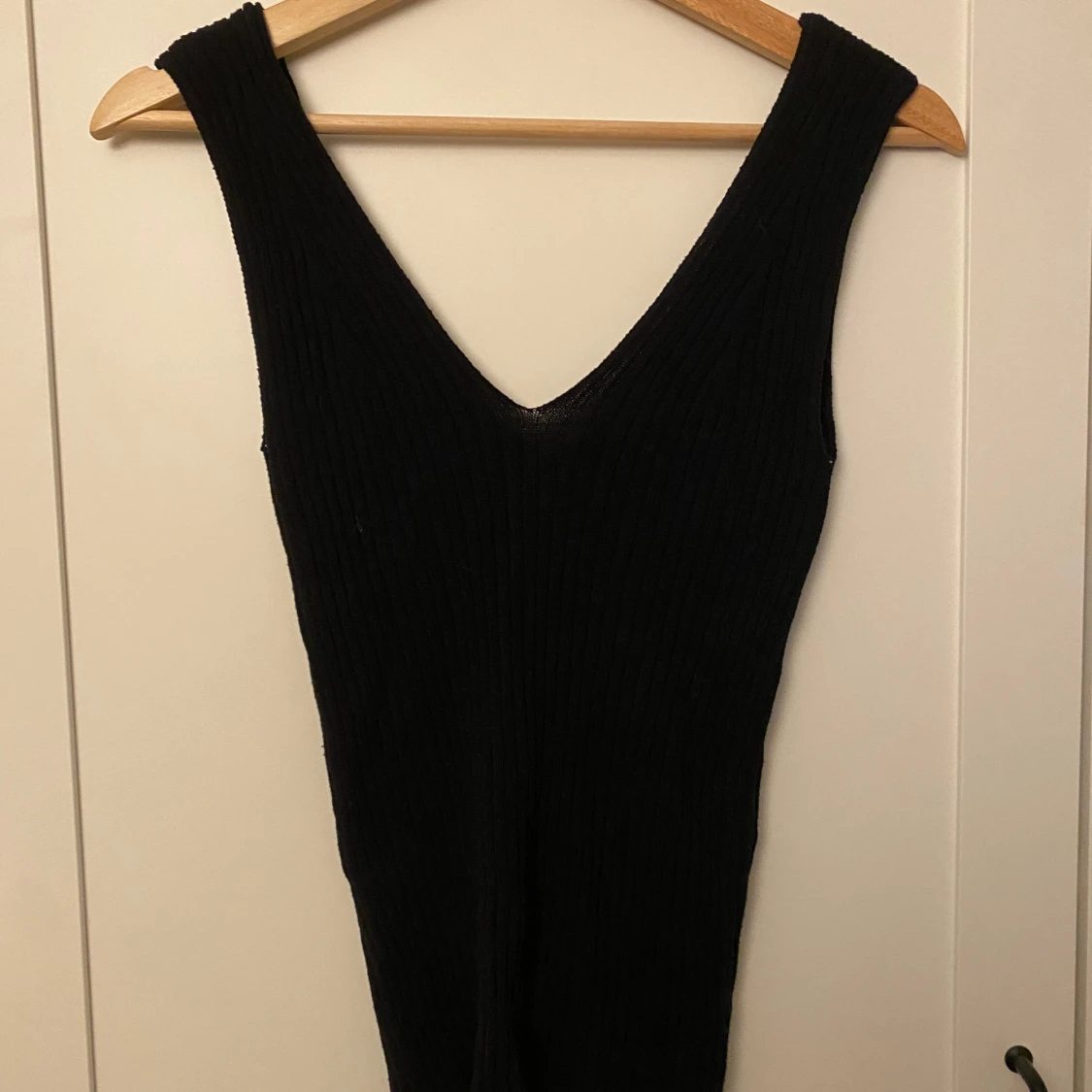 Snygg svart ribbat linne från Vila i storlek XS. Linnet har en stilren design med en djup v-ringning och är ärmlös.