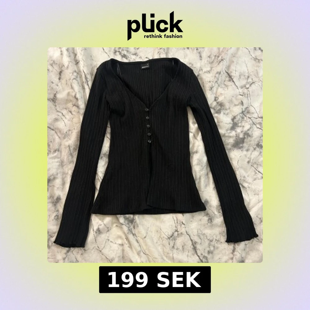 Svart ribbad topp från Gina tricot med v-ringning och knappar framtill halvägs. Långärmad modell i stretchigt material som sitter snyggt och markerar figuren.