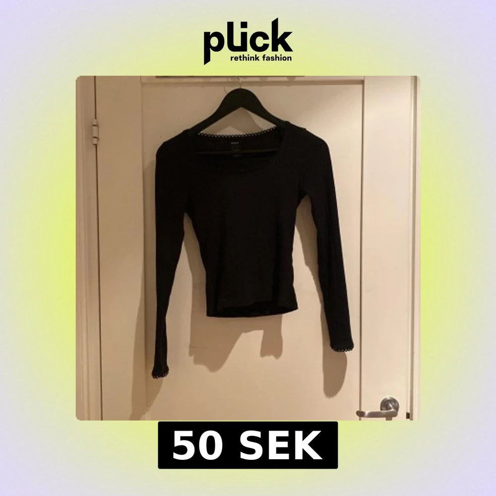 Svart långärmad topp från Lindex i storlek XS. Ribbad struktur och rund halsringning med söt spetskant. Materialet är mjukt och stretchigt, perfekt för en chill och stilren look. Ärmarna har samma spetsdetalj som halsen för extra vibe.