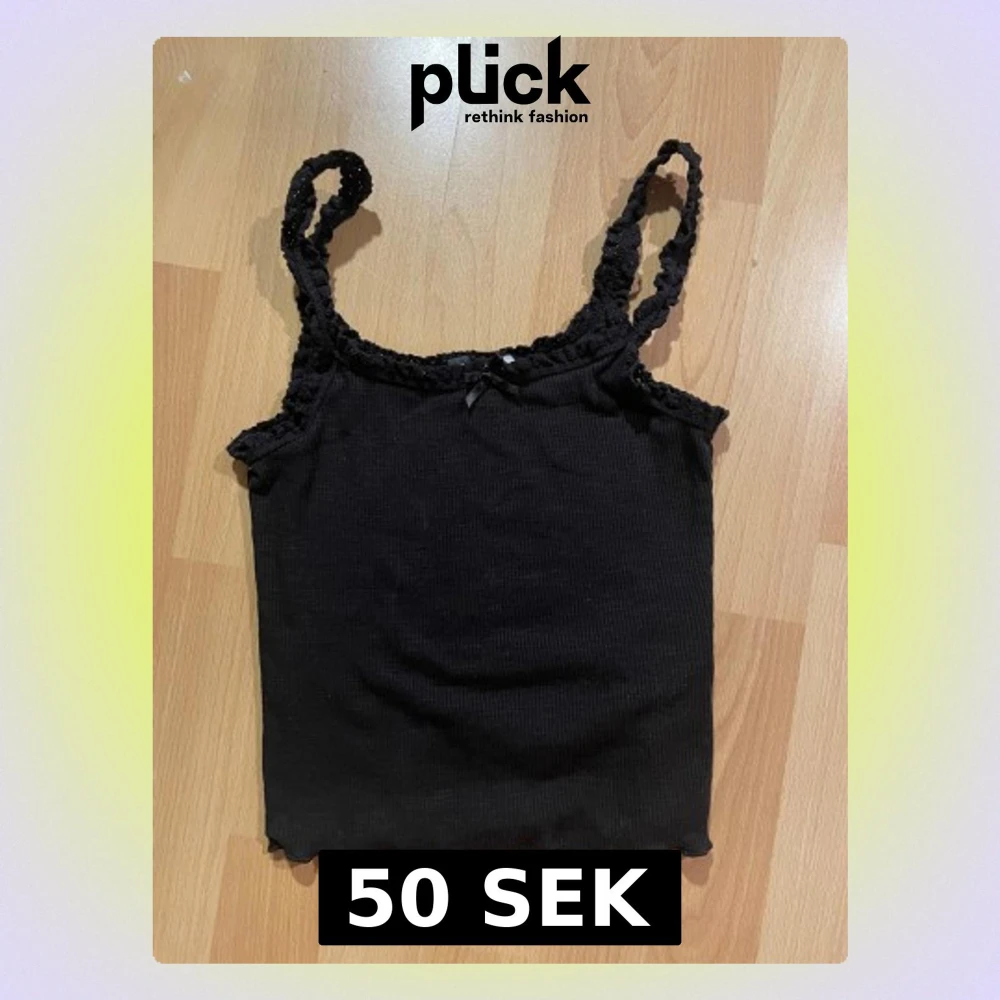 Svart ribbad linnetopp från H&M med volangkant och liten rosett framtill. Axelbanden är smala och dekorerade med spetsdetaljer.