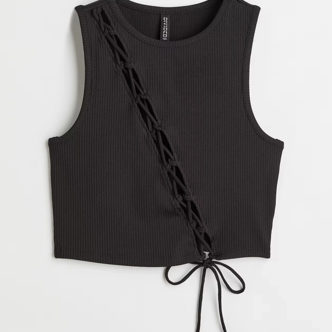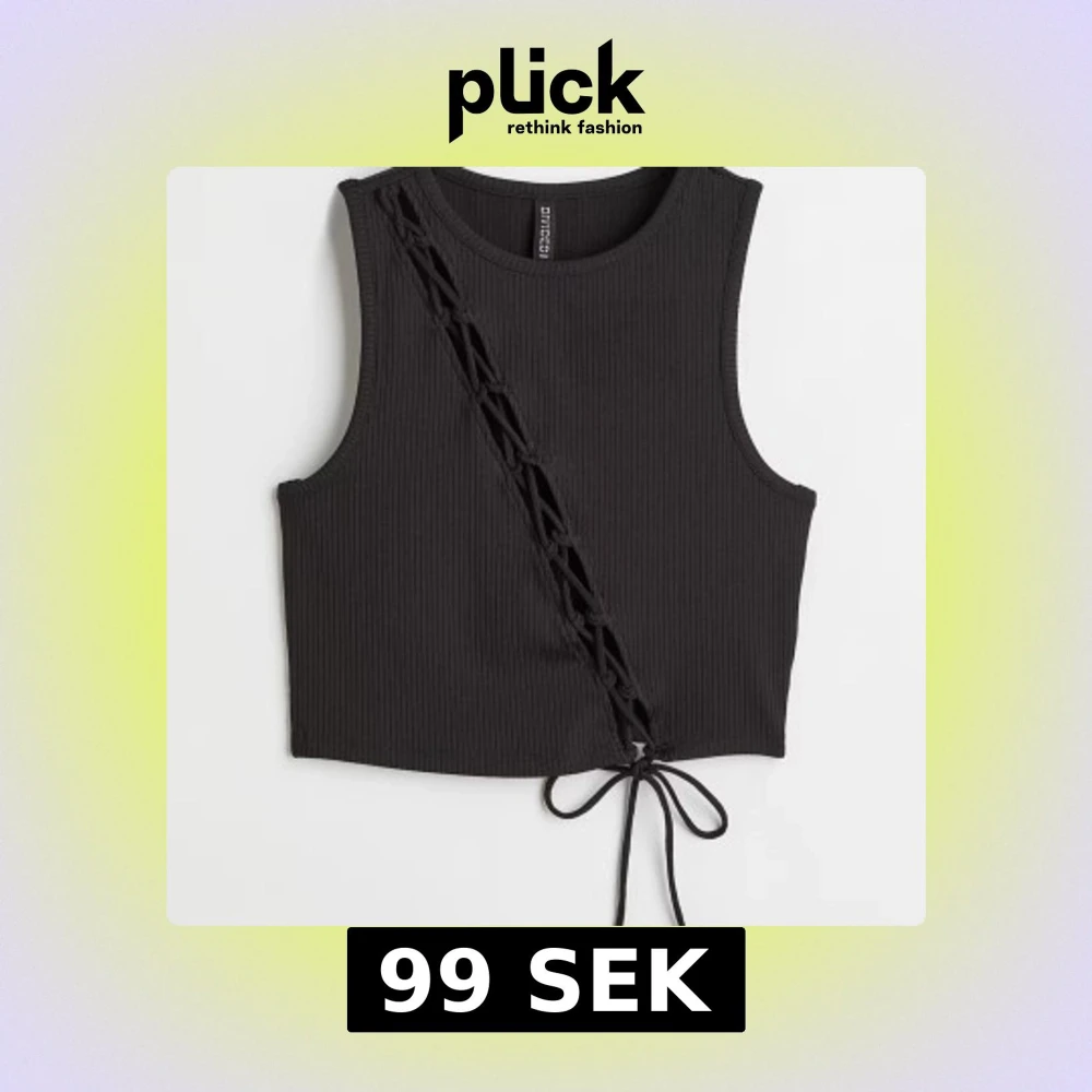 Säljer en svart croppad linnetopp från H&M med ribbad struktur och snörningsdetalj i diagonal över framsidan. Toppen är ärmlös och har en snygg knytning längst ner. Köpt för 149 men inte använd.