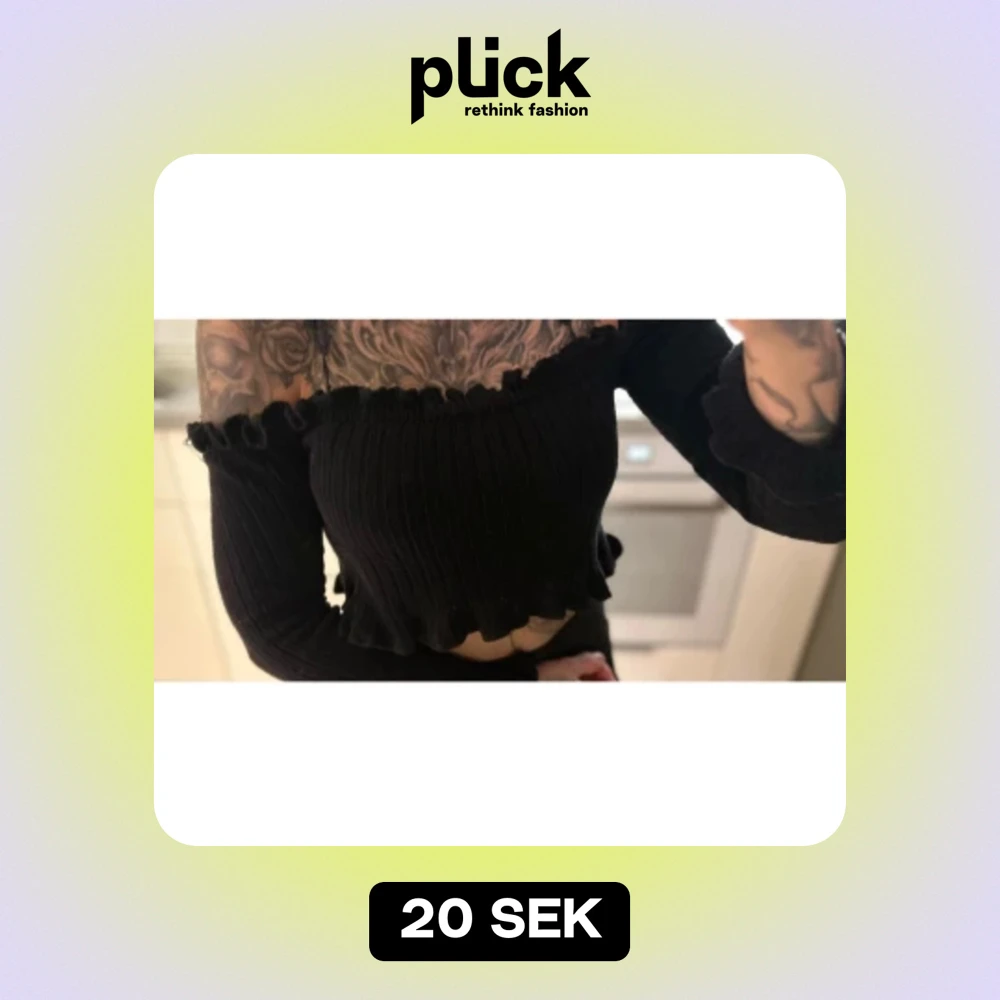 Svart ribbad offshoulder topp. Den är croppad och har långa ärmar med volangdetaljer vid ärmslut och nederkant. Storlek S!