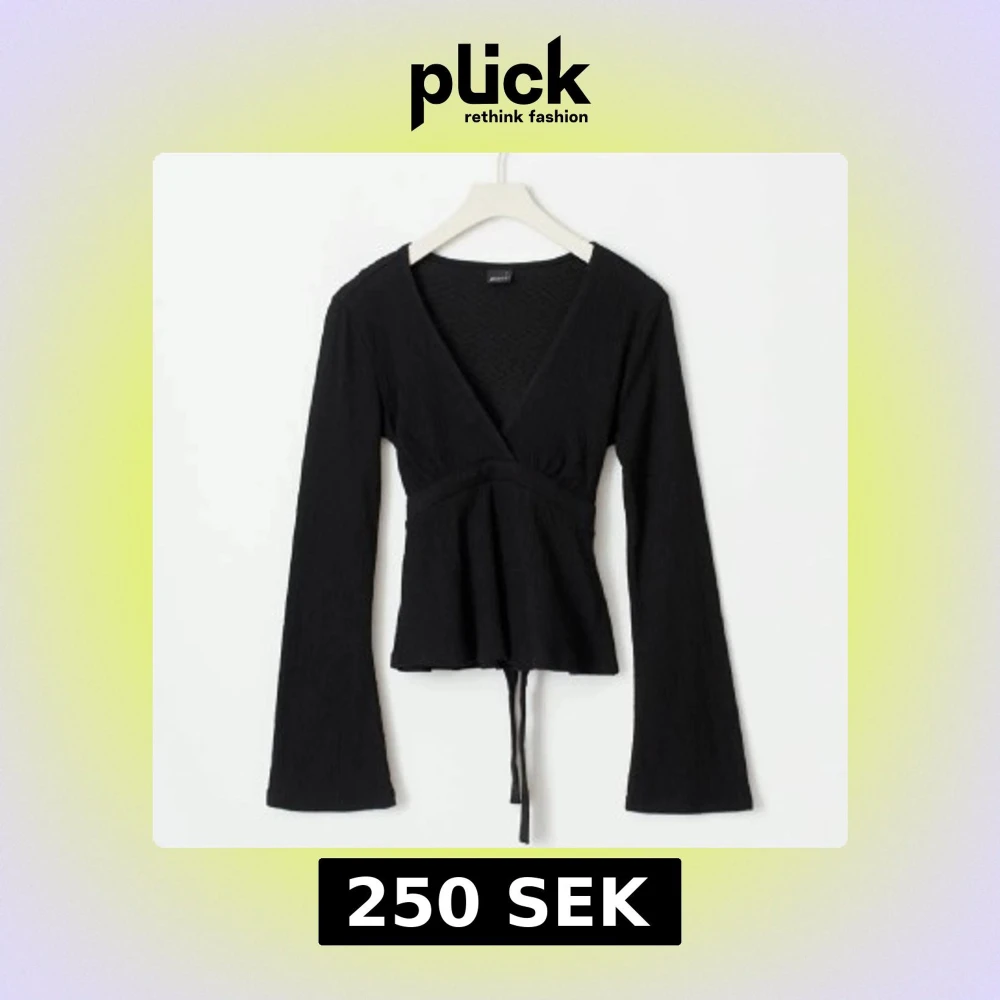 Snygg svart ribbad omlottopp med v-ringning och långa ärmar. Toppen har knytband i midjan för en justerbar passform. Perfekt för en stilren look. I mycket bra skick💗