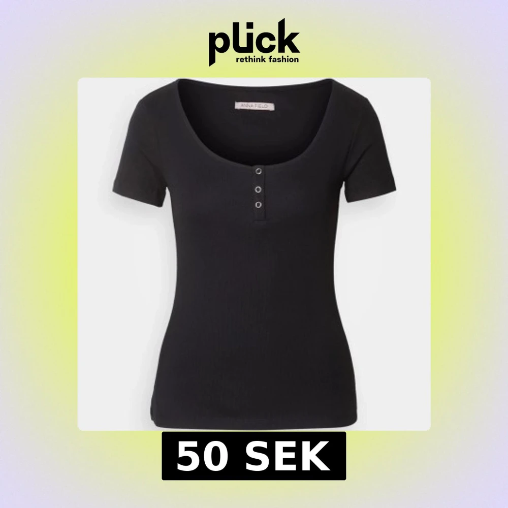 Svart ribbad topp med rundad urringning och tre dekorativa knappar framtill.