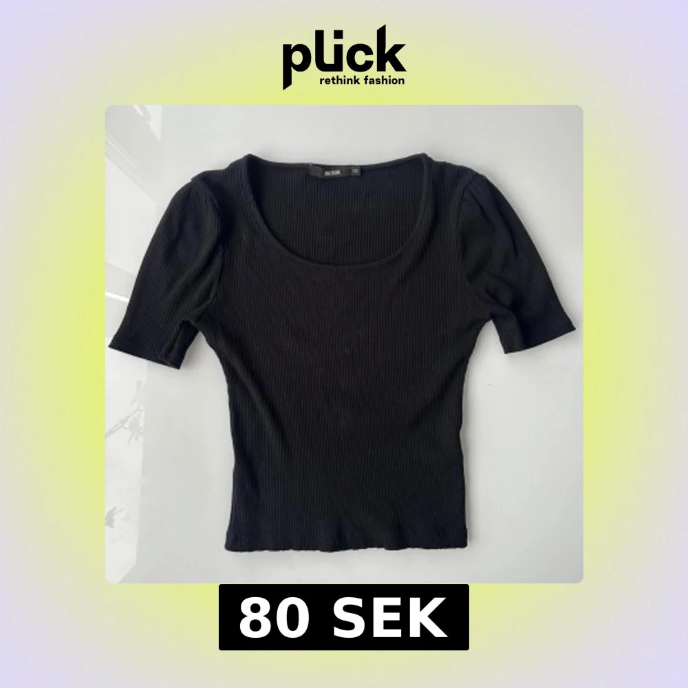 Svart ribbad topp från Bik Bok med rundad, djup urringning och korta puffärmar. Sitter snyggt och har en tight passform som framhäver figuren. Perfekt att styla med jeans eller kjol för en clean look
