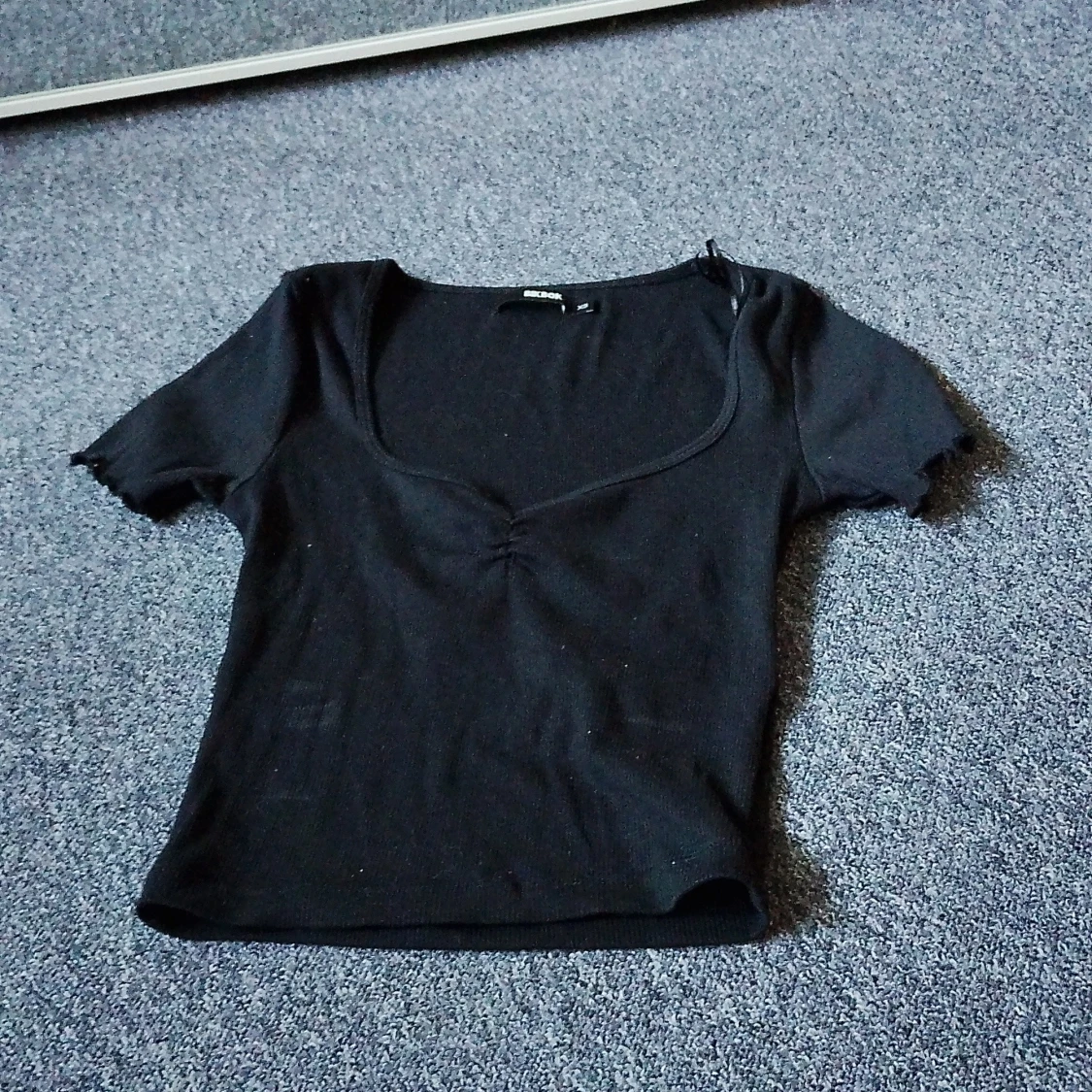 Svart ribbad topp från Bik Bok i storlek XS. Modellen har korta ärmar, djup v-ringning och snygg rynkning framtill. Materialet är mjukt och stretchigt, perfekt för att matcha med jeans eller kjol. Enkel och stilren design som alltid funkar. Kan tvättas innan jag skickar det om du vill😄