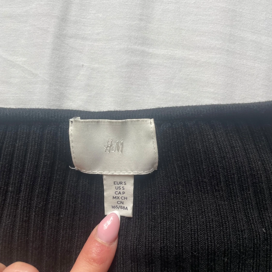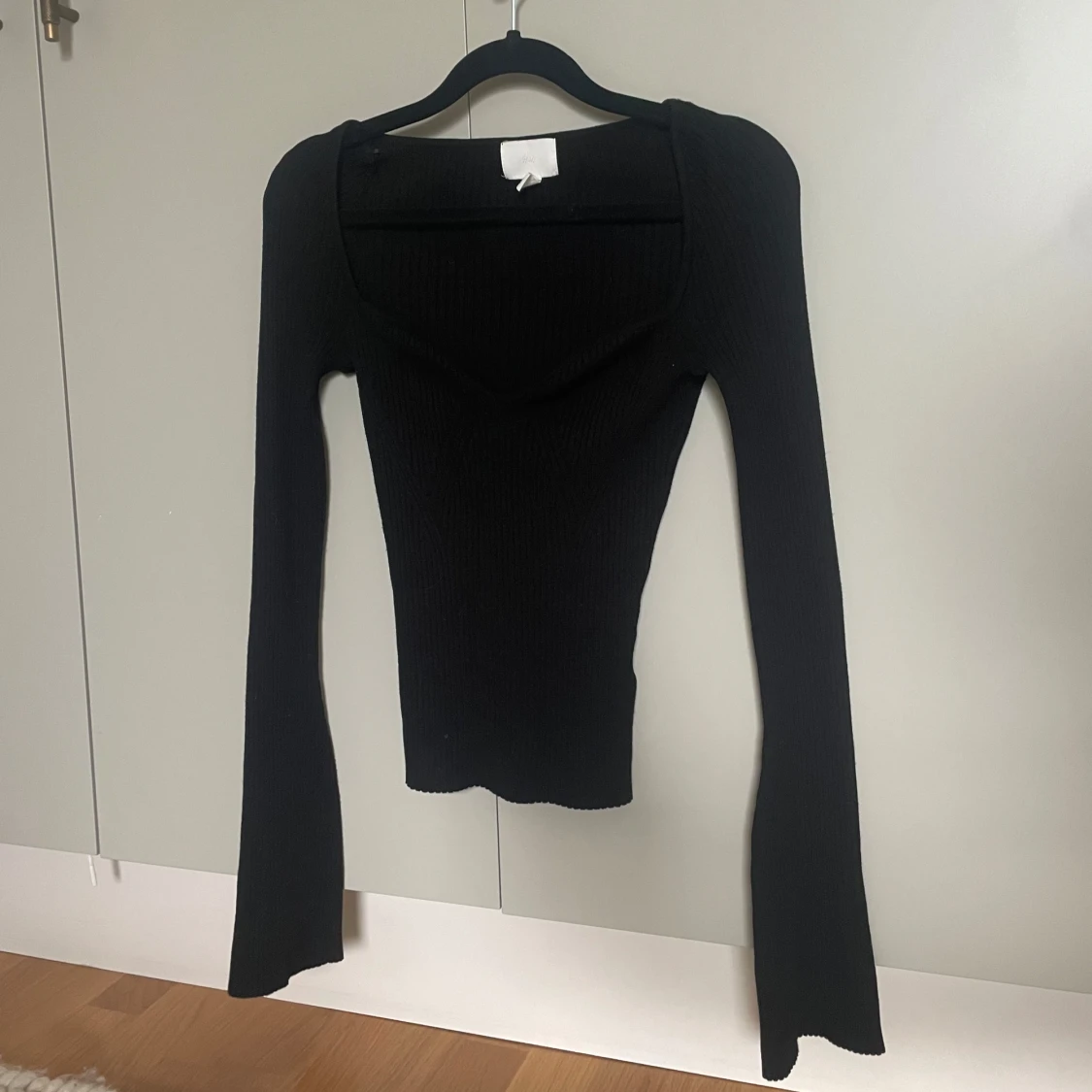 Supersnygg svart ribbad topp från H&M med långärmad design och markerad sweetheart-urringning. Toppen är tight och har vida ärmslut för en trendig look. Perfekt att styla med jeans eller kjol för en cool vibe.