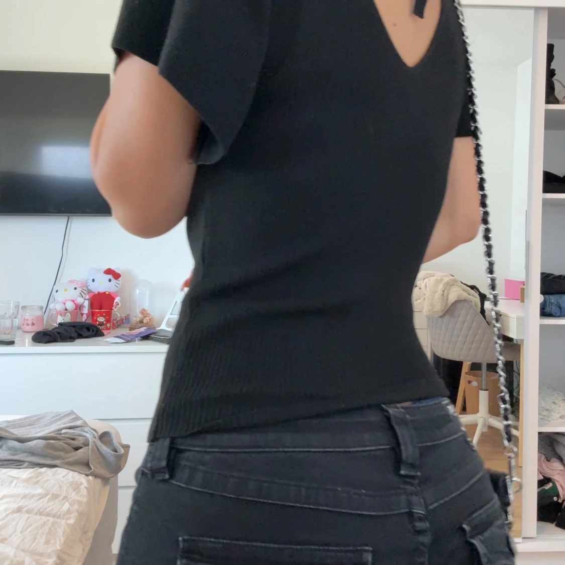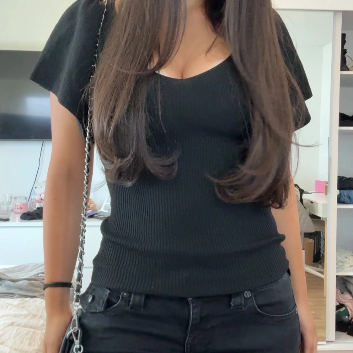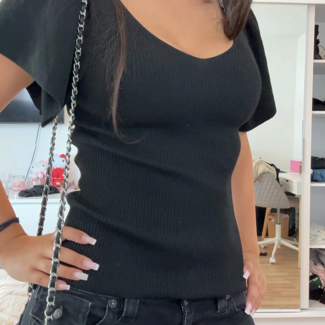 Svart ribbad topp från ONLY med v-ringning både fram och bak. Toppen har korta, lite fladdriga ärmar och sitter snyggt figurnära. Perfekt att styla med jeans eller kjol för en clean look. Aldrig använt 💕