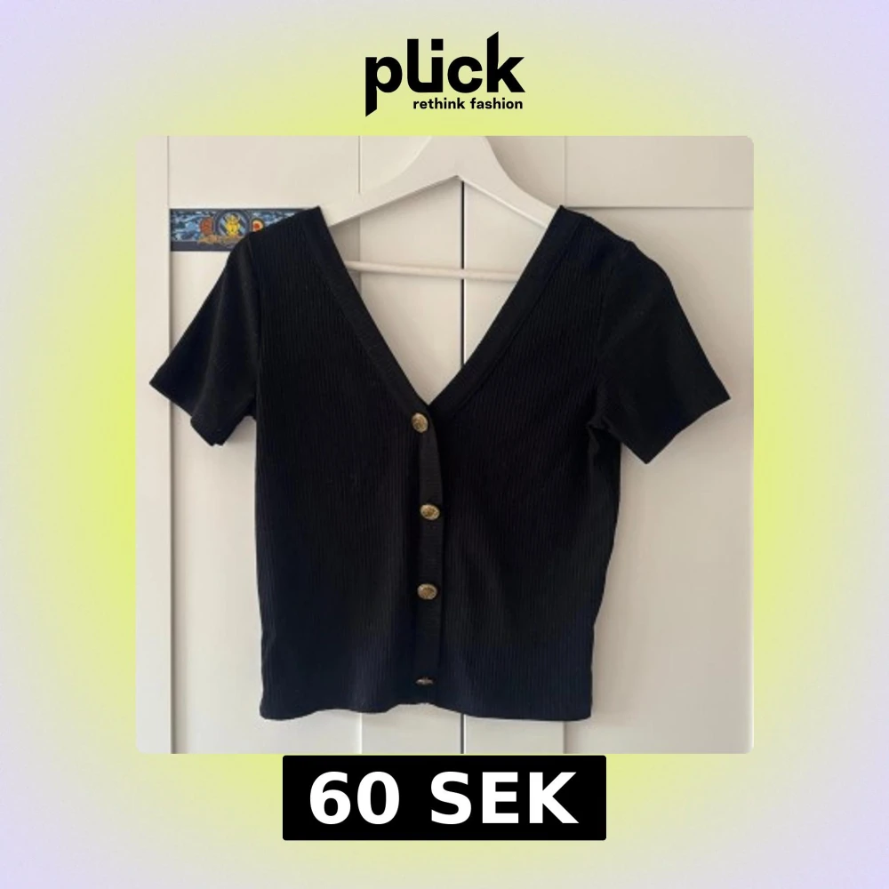 Svart ribbad topp med kort ärm och djup v-ringning. Toppen har snygga guldknappar framtill och perfekt för dig som gillar en enkel men ändå trendig look. Den sitter löst men väldigt fint, man kan även ha den off shoulder. Passar perfekt till vardag men går även att styla till fest.