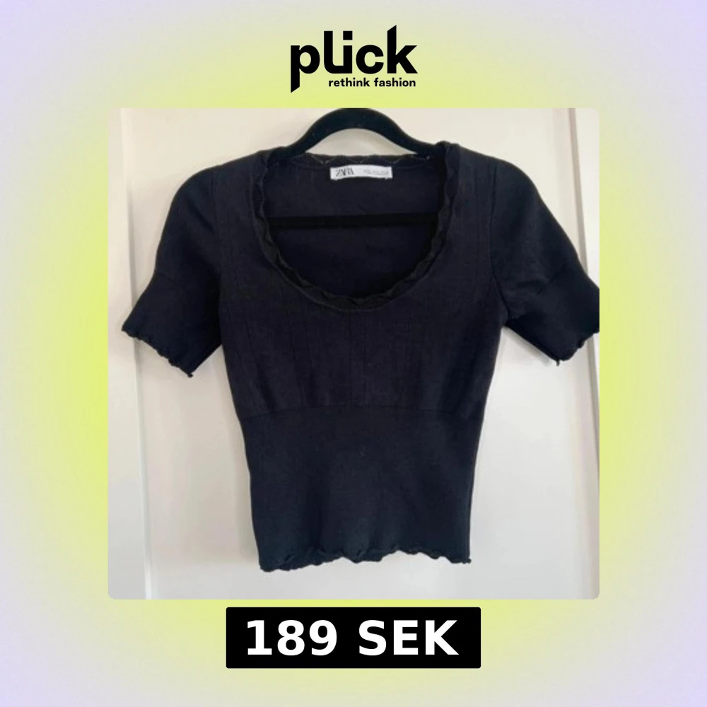 Säljer en svart ribbad topp från Zara med korta ärmar och v-ringad halsringning med volangkant. Toppen är figurnära och har en lätt croppad passform med vågig nederkant. Perfekt att styla till jeans eller kjol.
