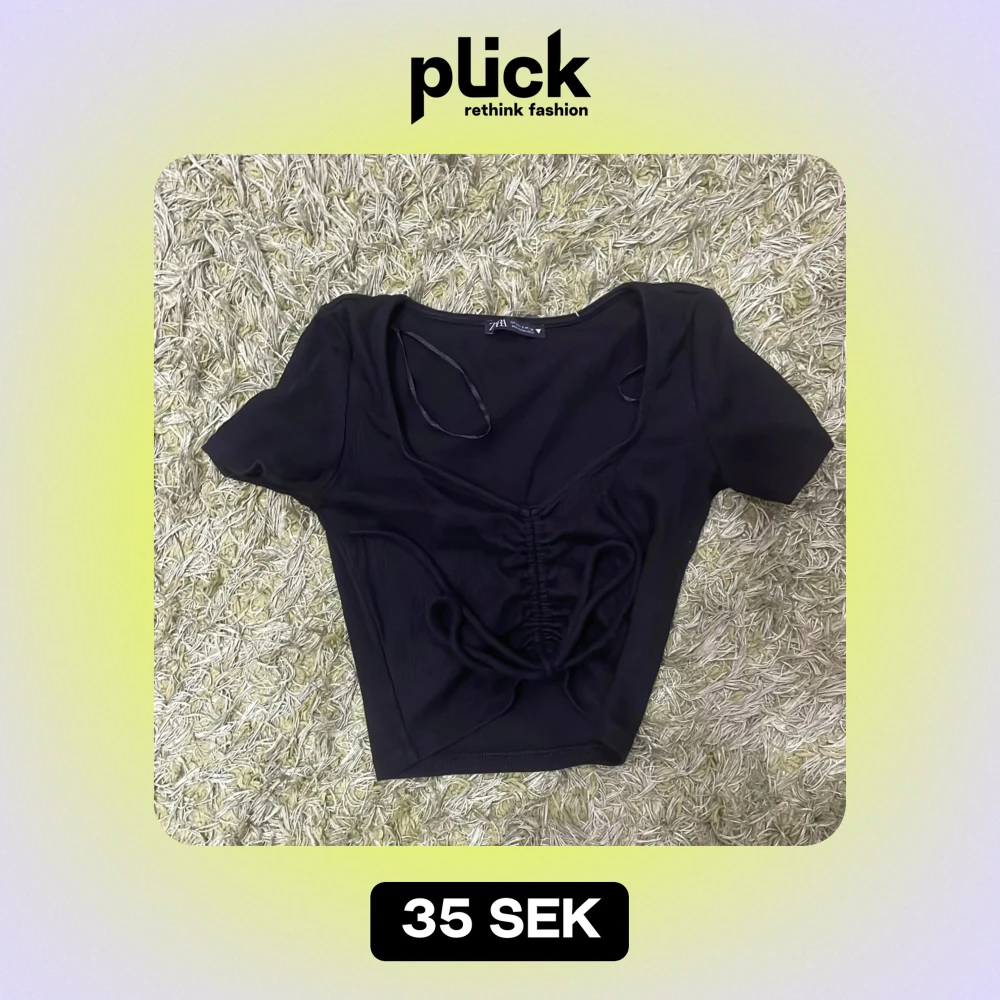 Säljer en snygg svart ribbad topp från Zara i storlek S. Toppen har en v-ringad design med knytning framtill som ger en cool look. Perfekt för både vardag och fest! 🖤