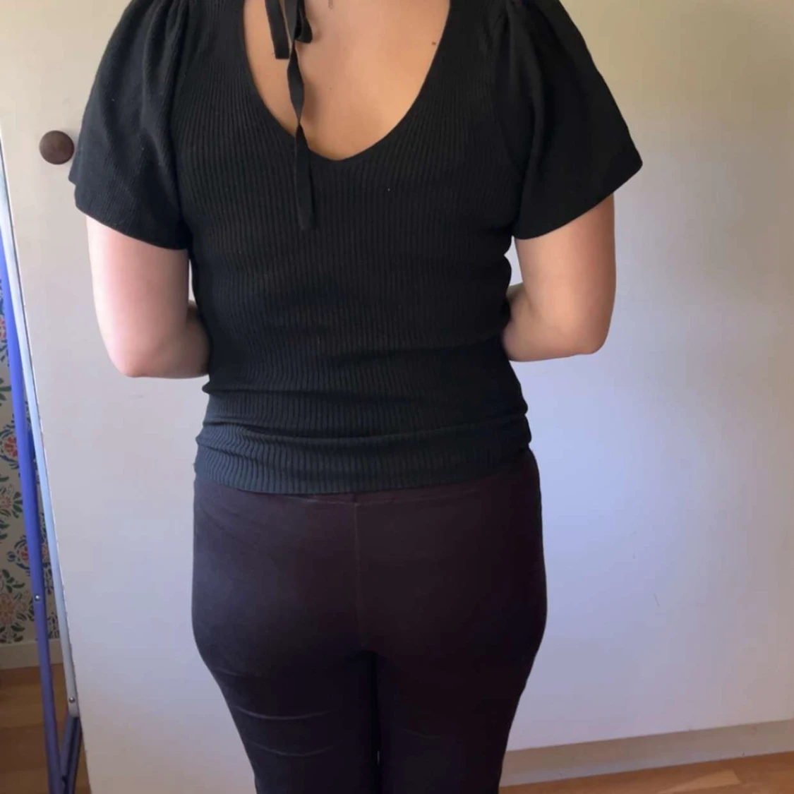 Svart ribbad topp med v-ringning både fram och bak samt korta puffärmar. Toppen har en snygg knytning i nacken och sitter figurnära. Perfekt för dig som gillar en enkel men ändå trendig look.