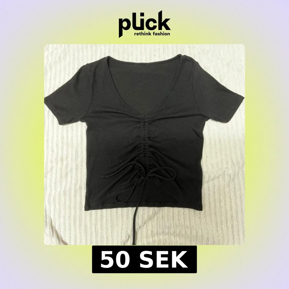 Svart ribbad topp med korta ärmar och v-ringning. Toppen har snygg snörning framtill som ger en cool rynkad effekt och croppad passform. Perfekt att styla med jeans eller kjol för en trendig look.