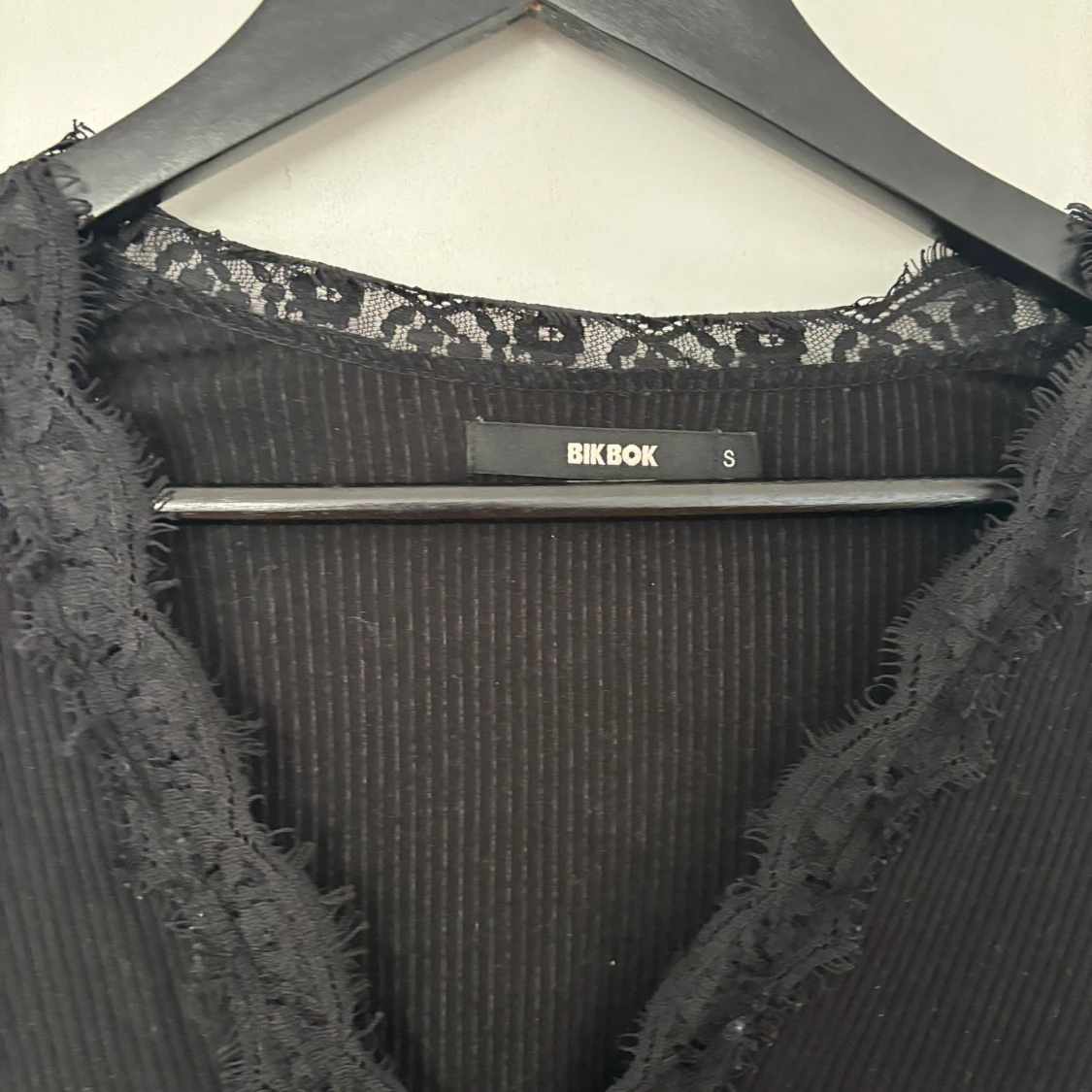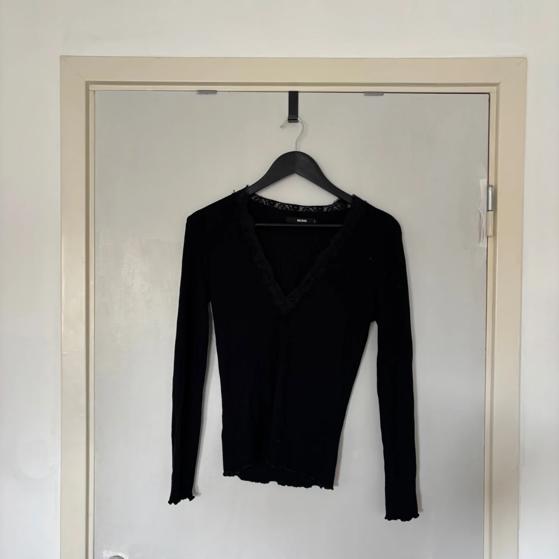 Svart långärmad topp från BikBok med ribbad struktur och djup v-ringning dekorerad med spetsdetaljer. Toppens kanter har en lätt vågig finish och den är figurnära i modellen. Perfekt för dig som gillar en stilren men ändå söt look.
