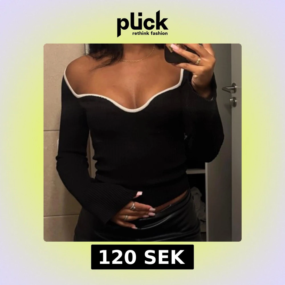 Säljer en svart ribbad topp med vit kant och djup v-ringning. Toppen har långa ärmar och figurnära passform.