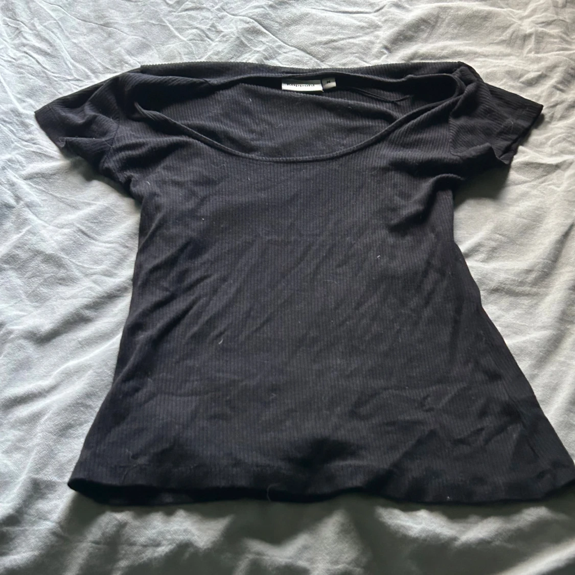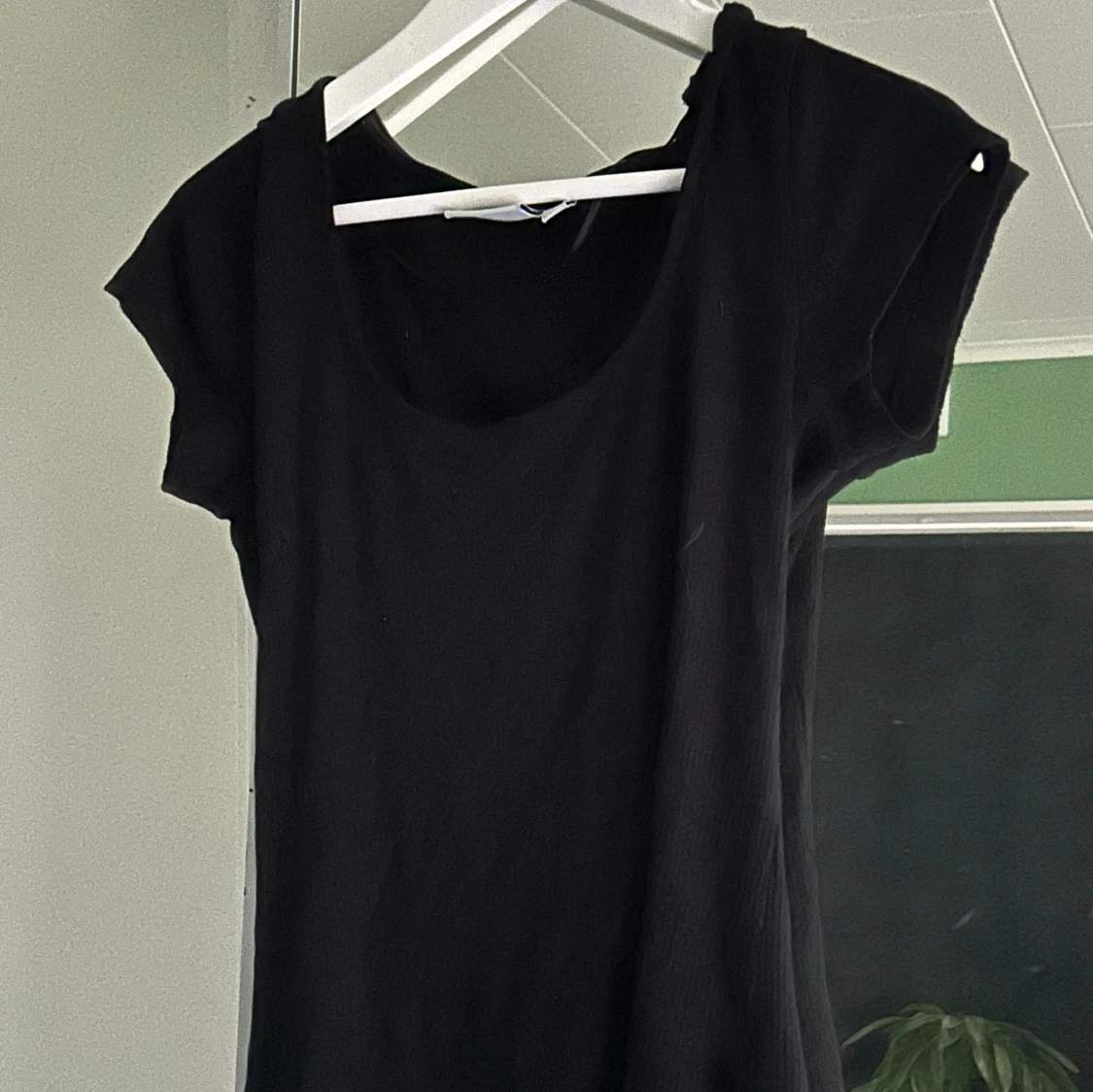 En svart ribbad topp från Kappahl i storlek M. Toppen har rundad halsringning och korta ärmar. Den är figurnära och tillverkad i ett mjukt, stretchigt material som passar perfekt till jeans eller kjol.