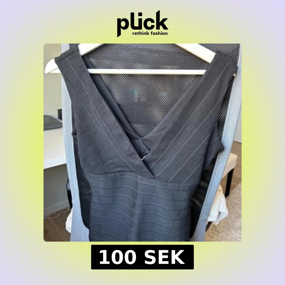 Snygg svart klänning med ribbad struktur och v-ringad design. Perfekt för en stilren look. Klänningen är ärmlös och har en figurnära passform som framhäver silhuetten. Är mer som M.